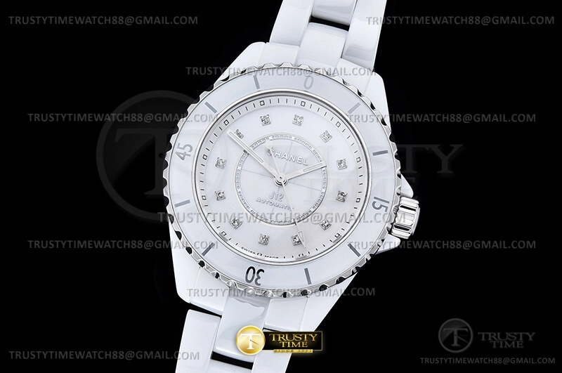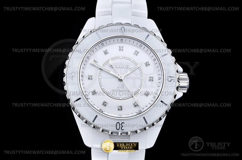 Часы Chanel из коллекции J-12. Классические женские часы Chanel J-12 33 H9741 премиального качества (Артикул магазина: CN-0294) оснащены надежным автоматическим механизмом с автоподзаводом (работает от амплитуды движения руки) калибра 12.2, в котором реализованы следующие функции: часовая, минутная и секундная стрелки, а так же максимально простой функционал без усложнений. Круглый корпус часов белого цвета, имеющий размер 33 мм и высоту 13 мм превосходно дополнит образ и украсит запястье своего обладателя. Для изготовления часов Chanel J-12 33 H9741 предлагаемых в нашем интернет-магазине, применяются керамика высокого качества (Швейцарский стандарт), а так же сапфировое стекло высокой прочности, благодаря чему обеспечивается максимальная защита от сколов и механических повреждений. Отличительной чертой данной модели является белый циферблат, часовые индексы которого обеспечивают камни. Завершает образ керамический браслет белого цвета с фирменной раскладывающейся застежкой Chanel. Водонепроницаемость данной модели составляет 30М (WR30) – допускается минимальное воздействие с водой.