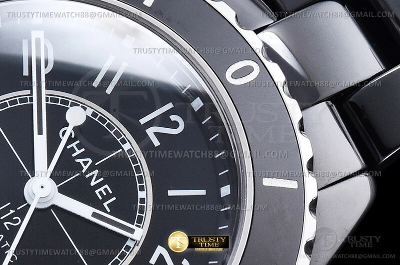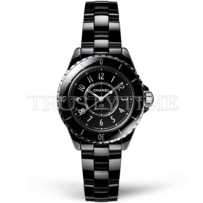 Часы Chanel из коллекции J-12. Классические женские часы Chanel J-12 33 H5696 премиального качества (Артикул магазина: CN-0299) оснащены надежным автоматическим механизмом с автоподзаводом (работает от амплитуды движения руки) калибра 12.2, в котором реализованы следующие функции: часовая, минутная и секундная стрелки, а так же максимально простой функционал без усложнений. Круглый корпус часов черного цвета, имеющий размер 33 мм и высоту 13 мм превосходно дополнит образ и украсит запястье своего обладателя. Для изготовления часов Chanel J-12 33 H5696 предлагаемых в нашем интернет-магазине, применяются керамика высокого качества (Швейцарский стандарт), а так же сапфировое стекло высокой прочности, благодаря чему обеспечивается максимальная защита от сколов и механических повреждений. Отличительной чертой данной модели является черный циферблат, часовые индексы которого обеспечивают арабские цифры. Завершает образ керамический браслет черного цвета с фирменной раскладывающейся застежкой Chanel. Водонепроницаемость данной модели составляет 30М (WR30) – допускается минимальное воздействие с водой.
