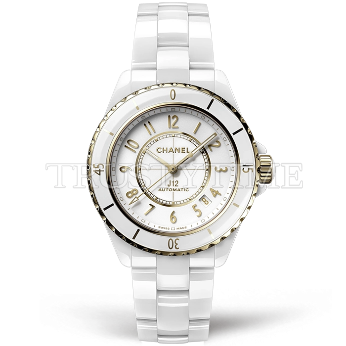 Часы Chanel из коллекции J-12. Классические женские часы Chanel J-12 38 H9540 премиального качества (Артикул магазина: CN-0272) оснащены надежным автоматическим механизмом с автоподзаводом (работает от амплитуды движения руки) калибра 12.1, в котором реализованы следующие функции: часовая, минутная и секундная стрелки, а так же дата. Круглый корпус часов белого цвета, имеющий размер 38 мм и высоту 11.5 мм превосходно дополнит образ и украсит запястье своего обладателя. Для изготовления часов Chanel J-12 38 H9540 предлагаемых в нашем интернет-магазине, применяются керамика высокого качества (Швейцарский стандарт), а так же сапфировое стекло высокой прочности, благодаря чему обеспечивается максимальная защита от сколов и механических повреждений. Отличительной чертой данной модели является белый циферблат, часовые индексы которого обеспечивают арабские цифры. Завершает образ керамический браслет белого цвета с фирменной раскладывающейся застежкой Chanel. Водонепроницаемость данной модели составляет 30М (WR30) – допускается минимальное воздействие с водой.