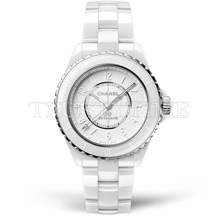 Часы Chanel из коллекции J-12. Классические женские часы Chanel J-12 38 H6186 премиального качества (Артикул магазина: CN-0274) оснащены надежным автоматическим механизмом с автоподзаводом (работает от амплитуды движения руки) калибра 12.1, в котором реализованы следующие функции: часовая, минутная и секундная стрелки, а так же максимально простой функционал без усложнений. Круглый корпус часов белого цвета, имеющий размер 38 мм и высоту 13 мм превосходно дополнит образ и украсит запястье своего обладателя. Для изготовления часов Chanel J-12 38 H6186 предлагаемых в нашем интернет-магазине, применяются керамика высокого качества (Швейцарский стандарт), а так же сапфировое стекло высокой прочности, благодаря чему обеспечивается максимальная защита от сколов и механических повреждений. Отличительной чертой данной модели является белый циферблат, часовые индексы которого обеспечивают арабские цифры. Завершает образ керамический браслет белого цвета с фирменной раскладывающейся застежкой Chanel. Водонепроницаемость данной модели составляет 30М (WR30) – допускается минимальное воздействие с водой.