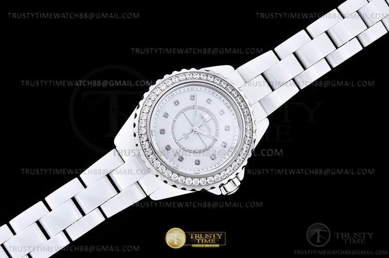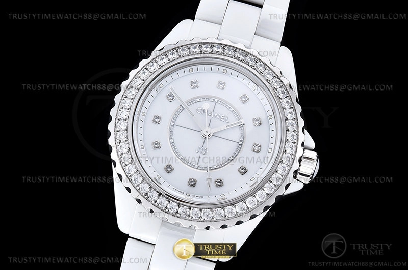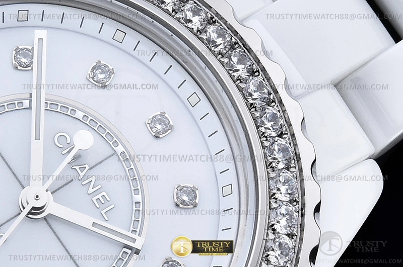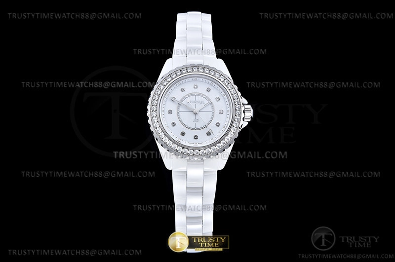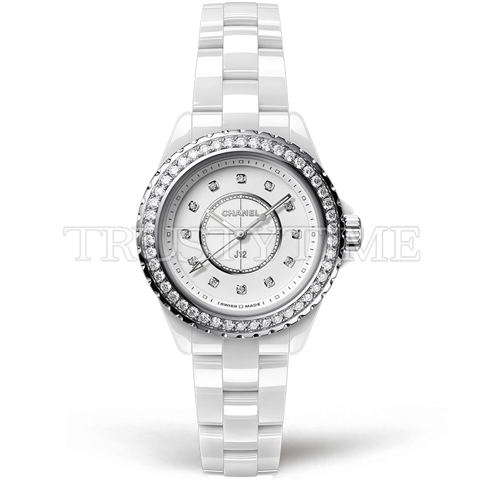 Часы Chanel из коллекции J-12. Классические женские часы Chanel J-12 33 H6418 премиального качества (Артикул магазина: CN-0285) оснащены надежным кварцевым механизмом (работает от батареи) калибра Swiss Quartz ETA, в котором реализованы следующие функции: часовая, минутная и секундная стрелки, а так же максимально простой функционал без усложнений. Круглый корпус часов белого цвета, имеющий размер 33 мм и высоту 12.3 мм превосходно дополнит образ и украсит запястье своего обладателя. Для изготовления часов Chanel J-12 33 H6418 предлагаемых в нашем интернет-магазине, применяются керамика высокого качества (Швейцарский стандарт), а так же сапфировое стекло высокой прочности, благодаря чему обеспечивается максимальная защита от сколов и механических повреждений. Отличительной чертой данной модели является белый циферблат, часовые индексы которого обеспечивают камни. Завершает образ керамический браслет белого цвета с фирменной раскладывающейся застежкой Chanel. Водонепроницаемость данной модели составляет 30М (WR30) – допускается минимальное воздействие с водой.