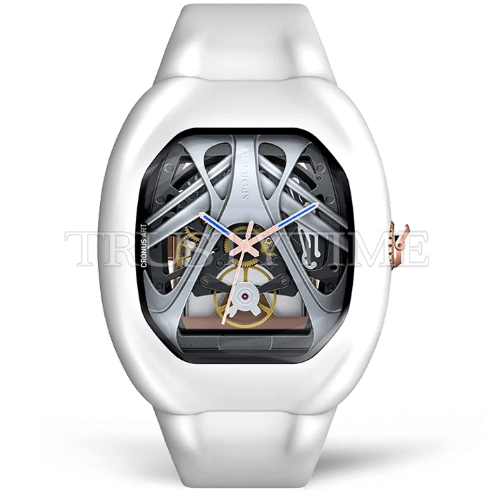 Часы CronusArt из коллекции . Спортивные мужские часы CronusArt Stinless Steel Watch R1-001 Оригинал (Артикул магазина: CA-0453) оснащены надежным автоматическим механизмом с автоподзаводом (работает от амплитуды движения руки) калибра CR-X2205, в котором реализованы следующие функции: часовая, минутная и секундная стрелки, а так же максимально простой функционал без усложнений. Бочкообразный корпус часов белого цвета, имеющий размер 42 мм x 49 мм и высоту 14 мм превосходно дополнит образ и украсит запястье своего обладателя. Для изготовления часов CronusArt Stinless Steel Watch R1-001 предлагаемых в нашем интернет-магазине, применяются нержавеющая сталь высокого качества (Швейцарский стандарт), а так же сапфировое стекло высокой прочности, благодаря чему обеспечивается максимальная защита от сколов и механических повреждений. Отличительной чертой данной модели является скелетонизированный циферблат, без меток и цифр. Завершает образ каучуковый ремешок белого цвета с фирменной раскладывающейся застежкой CronusArt. Водонепроницаемость данной модели составляет .
