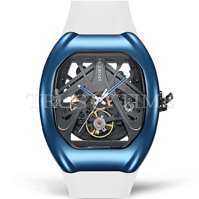 Часы CronusArt из коллекции . Спортивные мужские часы CronusArt Stinless Steel Watch R1-002 Оригинал (Артикул магазина: CA-0454) оснащены надежным автоматическим механизмом с автоподзаводом (работает от амплитуды движения руки) калибра CR-X2205, в котором реализованы следующие функции: часовая, минутная и секундная стрелки, а так же максимально простой функционал без усложнений. Бочкообразный корпус часов синего цвета, имеющий размер 42 мм x 49 мм и высоту 14 мм превосходно дополнит образ и украсит запястье своего обладателя. Для изготовления часов CronusArt Stinless Steel Watch R1-002 предлагаемых в нашем интернет-магазине, применяются нержавеющая сталь высокого качества (Швейцарский стандарт), а так же сапфировое стекло высокой прочности, благодаря чему обеспечивается максимальная защита от сколов и механических повреждений. Отличительной чертой данной модели является скелетонизированный циферблат, без меток и цифр. Завершает образ каучуковый ремешок белого цвета с фирменной раскладывающейся застежкой CronusArt. Водонепроницаемость данной модели составляет .