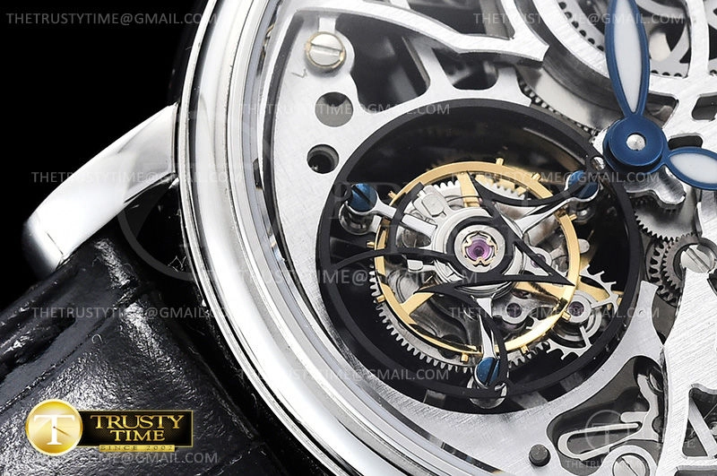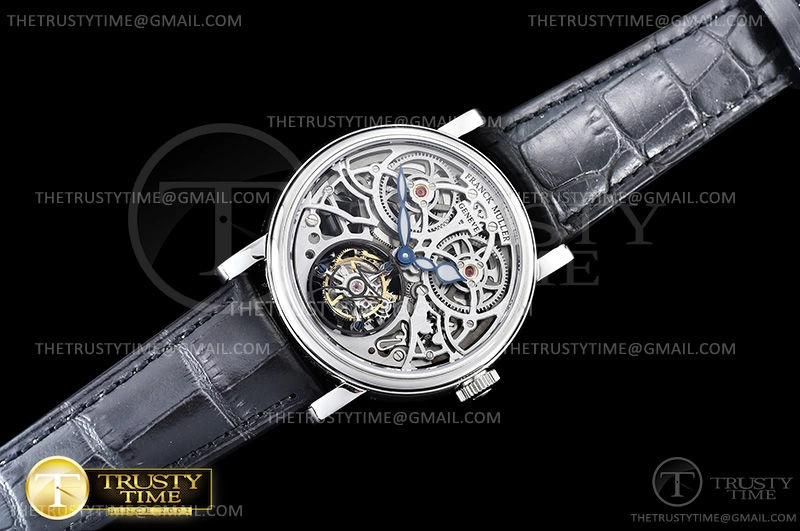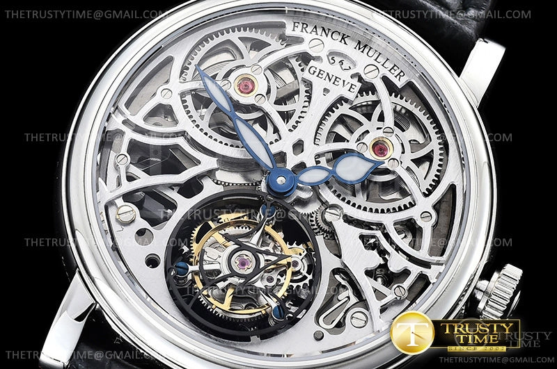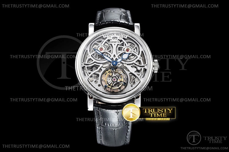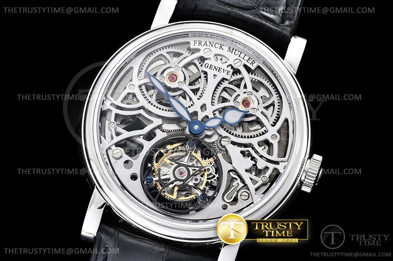 Часы Franck Muller из коллекции Cintree Curvex. Классические мужские часы Franck Muller Cintree Curvex Giga Tourbillon 7048-T-G-SQT-BR премиального качества (Артикул магазина: FM-0559) оснащены надежным автоматическим механизмом с ручным заводом калибра Seagull Handwind Tourbillon, в котором реализованы следующие функции: часова и минутка стрелки, а так же турбийон. Круглый корпус часов стального цвета, имеющий размер 43 мм и высоту 12 мм превосходно дополнит образ и украсит запястье своего обладателя. Для изготовления часов Franck Muller Cintree Curvex Giga Tourbillon 7048-T-G-SQT-BR предлагаемых в нашем интернет-магазине, применяются нержавеющая сталь 316L высокого качества (Швейцарский стандарт), а так же сапфировое стекло высокой прочности, благодаря чему обеспечивается максимальная защита от сколов и механических повреждений. Отличительной чертой данной модели является скелетонизированный циферблат, без меток и цифр. Завершает образ кожаный ремешок черного цвета с фирменной классической застежкой Franck Muller. Водонепроницаемость данной модели составляет 30М (WR30) – допускается минимальное воздействие с водой.