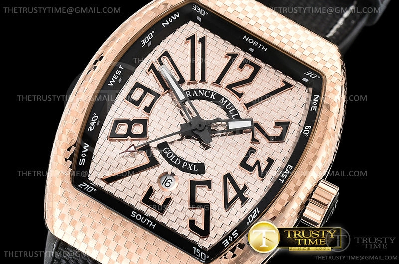 Часы Franck Muller из коллекции Vanguard. Классические мужские часы Franck Muller Vanguard PXL V45-SCDT-PXL-RG премиального качества (Артикул магазина: FM-0635) оснащены надежным автоматическим механизмом с автоподзаводом (работает от амплитуды движения руки) калибра ETA2824-2, в котором реализованы следующие функции: часовая, минутная и секундная стрелки, а так же дата. Бочкообразный корпус часов розового цвета, имеющий размер 44 мм x 54 мм и высоту 13 мм превосходно дополнит образ и украсит запястье своего обладателя. Для изготовления часов Franck Muller Vanguard PXL V45-SCDT-PXL-RG предлагаемых в нашем интернет-магазине, применяются нержавеющая сталь 316L высокого качества (Швейцарский стандарт), а так же сапфировое стекло высокой прочности, благодаря чему обеспечивается максимальная защита от сколов и механических повреждений. Отличительной чертой данной модели является золотой циферблат, часовые индексы которого обеспечивают арабские цифры. Завершает образ нейлоновый ремешок черного цвета с фирменной раскладывающейся застежкой Franck Muller. Водонепроницаемость данной модели составляет 30М (WR30) – допускается минимальное воздействие с водой.