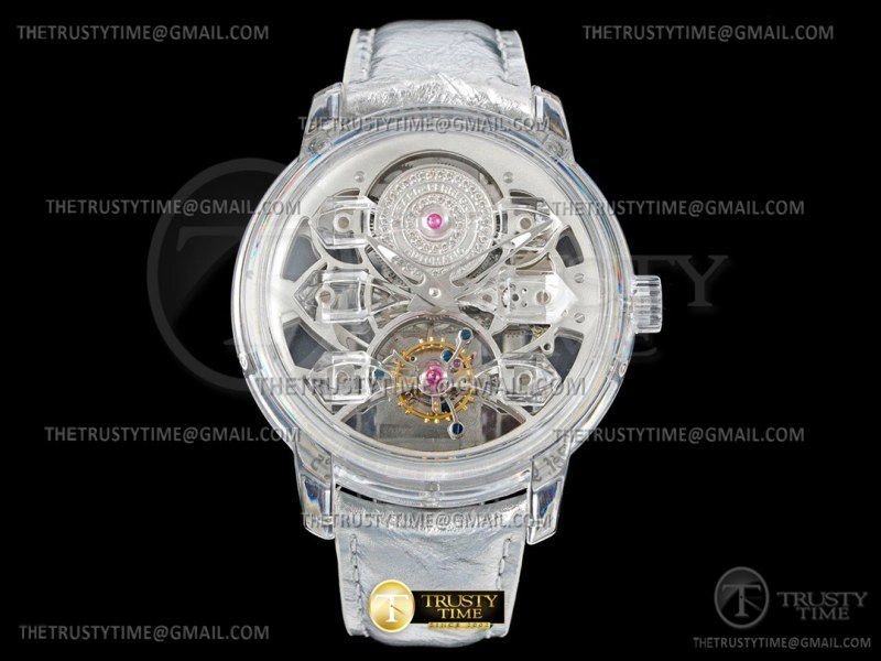 Часы Girard Perregaux из коллекции Bridges. Классические мужские часы Girard Perregaux Quasar Azure Tourbillon With Three Bridges 99295-43-001-BA6A премиального качества (Артикул магазина: GP-0484) оснащены надежным автоматическим механизмом с ручным заводом калибра Seagull Handwind Tourbillon, в котором реализованы следующие функции: часова и минутка стрелки, а так же турбийон. Круглый корпус часов прозрачного цвета, имеющий размер 46 мм и высоту 15.5 мм превосходно дополнит образ и украсит запястье своего обладателя. Для изготовления часов Girard Perregaux Quasar Azure Tourbillon With Three Bridges 99295-43-001-BA6A предлагаемых в нашем интернет-магазине, применяются композитный материал высокого качества (Швейцарский стандарт), а так же сапфировое стекло высокой прочности, благодаря чему обеспечивается максимальная защита от сколов и механических повреждений. Отличительной чертой данной модели является скелетонизированный циферблат, без меток и цифр. Завершает образ кожаный ремешок белого цвета с фирменной раскладывающейся застежкой Girard Perregaux. Водонепроницаемость данной модели составляет 30М (WR30) – допускается минимальное воздействие с водой.
