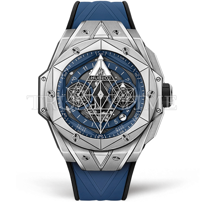 Часы Hublot из коллекции Big Bang Sang Bleu. Спортивные мужские часы Hublot Big Bang Sang Bleu II 45mm 418.NX.5107.RX.MXM20 премиального качества (Артикул магазина: HB-1023) оснащены надежным автоматическим механизмом с автоподзаводом (работает от амплитуды движения руки) калибра HUB1240, в котором реализованы следующие функции: часовая, минутная и секундная стрелки, а так же хронограф, дата. Многогранный корпус часов стального цвета, имеющий размер 45 мм и высоту 14 мм превосходно дополнит образ и украсит запястье своего обладателя. Для изготовления часов Hublot Big Bang Sang Bleu II 45mm 418.NX.5107.RX.MXM20 предлагаемых в нашем интернет-магазине, применяются титан высокого качества (Швейцарский стандарт), а так же сапфировое стекло высокой прочности, благодаря чему обеспечивается максимальная защита от сколов и механических повреждений. Отличительной чертой данной модели является синий циферблат, часовые индексы которого обеспечивают арабские цифры, часовые индексы которого обеспечивают часовые метки. Завершает образ каучуковый ремешок синего цвета с фирменной раскладывающейся застежкой Hublot. Водонепроницаемость данной модели составляет 30М (WR30) – допускается минимальное воздействие с водой.