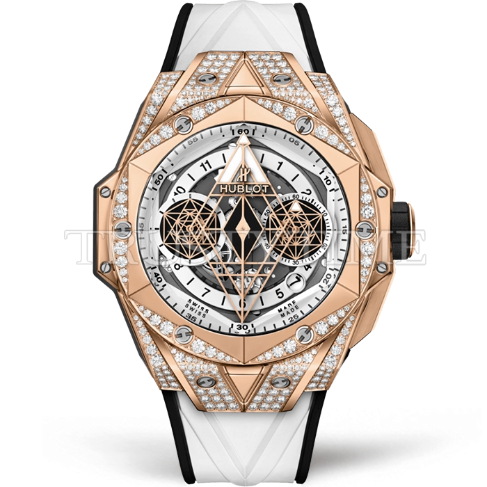 Часы Hublot из коллекции Big Bang Sang Bleu. Спортивные мужские часы Hublot Big Bang Sang Bleu II 45mm 418.OX.2001.RX.1604.MXM20 премиального качества (Артикул магазина: HB-1072) оснащены надежным автоматическим механизмом с автоподзаводом (работает от амплитуды движения руки) калибра HUB1240, в котором реализованы следующие функции: часовая, минутная и секундная стрелки, а так же хронограф, дата. Многогранный корпус часов розового цвета, имеющий размер 45 мм и высоту 14 мм превосходно дополнит образ и украсит запястье своего обладателя. Для изготовления часов Hublot Big Bang Sang Bleu II 45mm 418.OX.2001.RX.1604.MXM20 предлагаемых в нашем интернет-магазине, применяются нержавеющая сталь 316L высокого качества (Швейцарский стандарт), а так же сапфировое стекло высокой прочности, благодаря чему обеспечивается максимальная защита от сколов и механических повреждений. Отличительной чертой данной модели является белый циферблат, часовые индексы которого обеспечивают арабские цифры, часовые индексы которого обеспечивают часовые метки. Завершает образ каучуковый ремешок белого цвета с фирменной раскладывающейся застежкой Hublot. Водонепроницаемость данной модели составляет 30М (WR30) – допускается минимальное воздействие с водой.