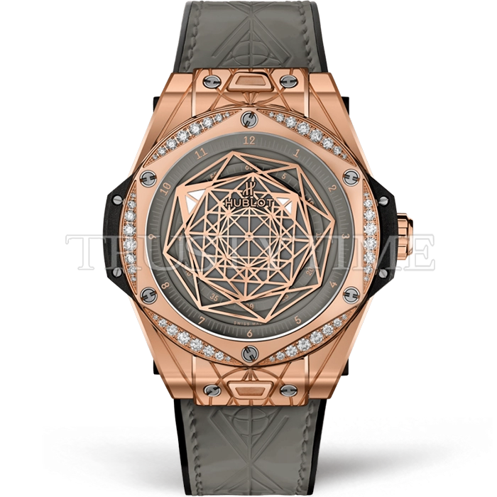 Часы Hublot из коллекции Big Bang Sang Bleu One Click. Спортивные мужские часы Hublot Big Bang Sang Bleu One Click 39mm 465.OS.7048.VR.1204 премиального качества (Артикул магазина: HB-1076) оснащены надежным автоматическим механизмом с автоподзаводом (работает от амплитуды движения руки) калибра HUB1710, в котором реализованы следующие функции: часова и минутка стрелки, а так же максимально простой функционал без усложнений. Круглый корпус часов розового цвета, имеющий размер 39 мм и высоту 12.5 мм превосходно дополнит образ и украсит запястье своего обладателя. Для изготовления часов Hublot Big Bang Sang Bleu One Click 39mm 465.OS.7048.VR.1204 предлагаемых в нашем интернет-магазине, применяются нержавеющая сталь 316L высокого качества (Швейцарский стандарт), а так же сапфировое стекло высокой прочности, благодаря чему обеспечивается максимальная защита от сколов и механических повреждений. Отличительной чертой данной модели является серый циферблат, часовые индексы которого обеспечивают часовые метки. Завершает образ кожаный ремешок серого цвета с фирменной раскладывающейся застежкой Hublot. Водонепроницаемость данной модели составляет 30М (WR30) – допускается минимальное воздействие с водой.