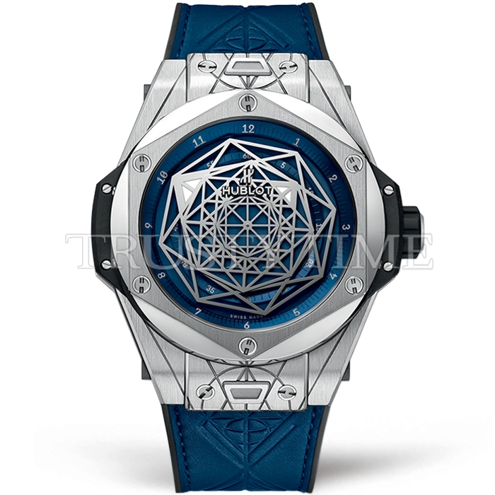 Часы Hublot из коллекции Big Bang Sang Bleu. Спортивные мужские часы Hublot Big Bang Sang Bleu 45mm 415.NX.7179.VR.MXM18 премиального качества (Артикул магазина: HB-0553) оснащены надежным автоматическим механизмом с автоподзаводом (работает от амплитуды движения руки) калибра HUB1213, в котором реализованы следующие функции: часова и минутка стрелки, а так же максимально простой функционал без усложнений. Круглый корпус часов серого цвета, имеющий размер 45 мм и высоту 14 мм превосходно дополнит образ и украсит запястье своего обладателя. Для изготовления часов Hublot Big Bang Sang Bleu 45mm 415.NX.7179.VR.MXM18 предлагаемых в нашем интернет-магазине, применяются титан высокого качества (Швейцарский стандарт), а так же сапфировое стекло высокой прочности, благодаря чему обеспечивается максимальная защита от сколов и механических повреждений. Отличительной чертой данной модели является синий циферблат, часовые индексы которого обеспечивают часовые метки. Завершает образ кожаный ремешок синего цвета с фирменной раскладывающейся застежкой Hublot. Водонепроницаемость данной модели составляет 30М (WR30) – допускается минимальное воздействие с водой.