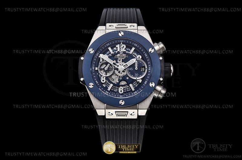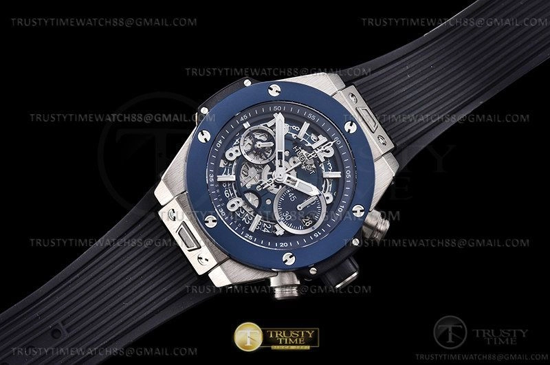 Часы Hublot из коллекции Big Bang Unico. Спортивные мужские часы Hublot Big Bang Unico 44mm 421.NL.5170.RX премиального качества (Артикул магазина: HB-1038) оснащены надежным автоматическим механизмом с автоподзаводом (работает от амплитуды движения руки) калибра HUB1280, в котором реализованы следующие функции: часовая, минутная и секундная стрелки, а так же хронограф, дата. Круглый корпус часов серого цвета, имеющий размер 44 мм и высоту 17 мм превосходно дополнит образ и украсит запястье своего обладателя. Для изготовления часов Hublot Big Bang Unico 44mm 421.NL.5170.RX предлагаемых в нашем интернет-магазине, применяются титан высокого качества (Швейцарский стандарт), а так же сапфировое стекло высокой прочности, благодаря чему обеспечивается максимальная защита от сколов и механических повреждений. Отличительной чертой данной модели является скелетонизированный циферблат, часовые индексы которого обеспечивают часовые метки. Завершает образ каучуковый ремешок синего цвета с фирменной раскладывающейся застежкой Hublot. Водонепроницаемость данной модели составляет 30М (WR30) – допускается минимальное воздействие с водой.