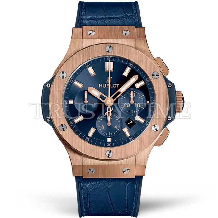 Часы Hublot из коллекции Big Bang. Спортивные мужские часы Hublot Big Bang Chronograph 44mm 301.PX.7180.LR премиального качества (Артикул магазина: HB-0845) оснащены надежным автоматическим механизмом с автоподзаводом (работает от амплитуды движения руки) калибра HUB4100, в котором реализованы следующие функции: часовая, минутная и секундная стрелки, а так же хронограф, дата. Круглый корпус часов розового цвета, имеющий размер 44.5 мм и высоту 14.5 мм превосходно дополнит образ и украсит запястье своего обладателя. Для изготовления часов Hublot Big Bang Chronograph 44mm 301.PX.7180.LR предлагаемых в нашем интернет-магазине, применяются нержавеющая сталь 316L высокого качества (Швейцарский стандарт), а так же сапфировое стекло высокой прочности, благодаря чему обеспечивается максимальная защита от сколов и механических повреждений. Отличительной чертой данной модели является синий циферблат, часовые индексы которого обеспечивают часовые метки. Завершает образ кожаный ремешок синего цвета с фирменной раскладывающейся застежкой Hublot. Водонепроницаемость данной модели составляет 30М (WR30) – допускается минимальное воздействие с водой.