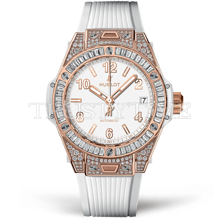 Часы Hublot из коллекции Big Bang One Click. Спортивные женские часы Hublot Big Bang One Click King Gold 39 465.OE.2080.RW.0904 премиального качества (Артикул магазина: HB-1265) оснащены надежным автоматическим механизмом с автоподзаводом (работает от амплитуды движения руки) калибра HUB4100, в котором реализованы следующие функции: часовая, минутная и секундная стрелки, а так же дата. Круглый корпус часов розового цвета, имеющий размер 39 мм и высоту 13 мм превосходно дополнит образ и украсит запястье своего обладателя. Для изготовления часов Hublot Big Bang One Click King Gold 39 465.OE.2080.RW.0904 предлагаемых в нашем интернет-магазине, применяются нержавеющая сталь 316L высокого качества (Швейцарский стандарт), а так же сапфировое стекло высокой прочности, благодаря чему обеспечивается максимальная защита от сколов и механических повреждений. Отличительной чертой данной модели является белый циферблат, часовые индексы которого обеспечивают камни. Завершает образ каучуковый ремешок белого цвета с фирменной раскладывающейся застежкой Hublot. Водонепроницаемость данной модели составляет 30М (WR30) – допускается минимальное воздействие с водой.