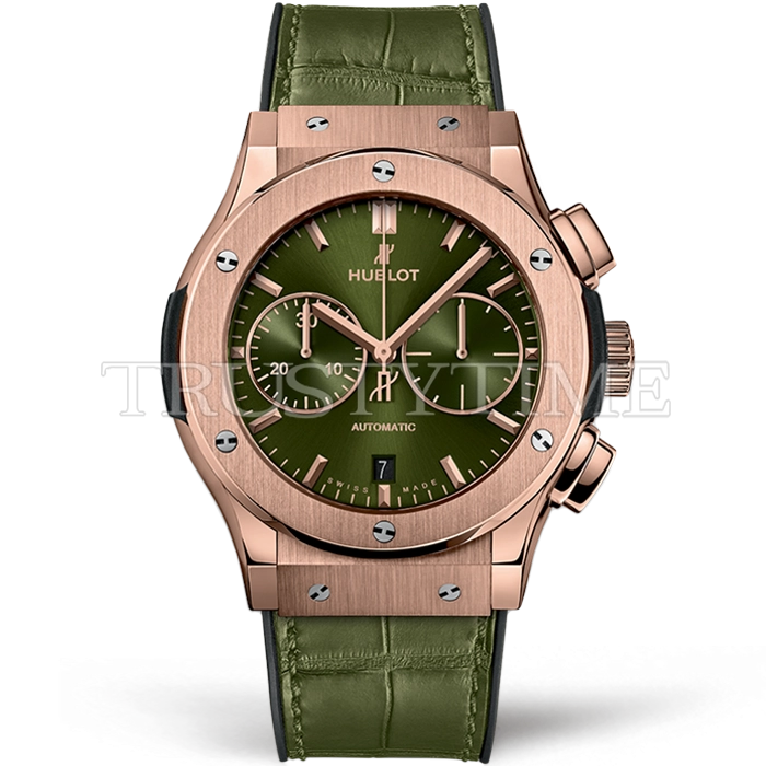 Часы Hublot из коллекции Classic Fusion Chronograph. Спортивные мужские часы Hublot Classic Fusion Chronograph King Gold 45mm 521.OX.8980.LR премиального качества (Артикул магазина: HB-0927) оснащены надежным автоматическим механизмом с автоподзаводом (работает от амплитуды движения руки) калибра Valjoux-7750, в котором реализованы следующие функции: часовая, минутная и секундная стрелки, а так же хронограф, дата. Круглый корпус часов розового цвета, имеющий размер 45 мм и высоту 15.5 мм превосходно дополнит образ и украсит запястье своего обладателя. Для изготовления часов Hublot Classic Fusion Chronograph King Gold 45mm 521.OX.8980.LR предлагаемых в нашем интернет-магазине, применяются нержавеющая сталь 316L высокого качества (Швейцарский стандарт), а так же сапфировое стекло высокой прочности, благодаря чему обеспечивается максимальная защита от сколов и механических повреждений. Отличительной чертой данной модели является зеленый циферблат, часовые индексы которого обеспечивают часовые метки. Завершает образ кожаный ремешок зеленого цвета с фирменной раскладывающейся застежкой Hublot. Водонепроницаемость данной модели составляет 30М (WR30) – допускается минимальное воздействие с водой.