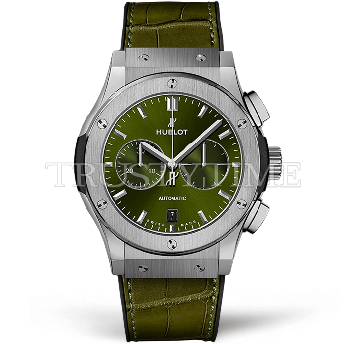 Часы Hublot из коллекции Classic Fusion Chronograph. Спортивные мужские часы Hublot Classic Fusion Chronograph 42mm 541.NX.8970.LR премиального качества (Артикул магазина: HB-1163) оснащены надежным автоматическим механизмом с автоподзаводом (работает от амплитуды движения руки) калибра Valjoux-7750, в котором реализованы следующие функции: часовая, минутная и секундная стрелки, а так же хронограф, дата. Круглый корпус часов стального цвета, имеющий размер 42 мм и высоту 15.5 мм превосходно дополнит образ и украсит запястье своего обладателя. Для изготовления часов Hublot Classic Fusion Chronograph 42mm 541.NX.8970.LR предлагаемых в нашем интернет-магазине, применяются титан высокого качества (Швейцарский стандарт), а так же сапфировое стекло высокой прочности, благодаря чему обеспечивается максимальная защита от сколов и механических повреждений. Отличительной чертой данной модели является зеленый циферблат, часовые индексы которого обеспечивают часовые метки. Завершает образ кожаный ремешок зеленого цвета с фирменной раскладывающейся застежкой Hublot. Водонепроницаемость данной модели составляет 30М (WR30) – допускается минимальное воздействие с водой.
