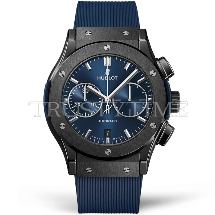 Часы Hublot из коллекции Classic Fusion Chronograph. Спортивные мужские часы Hublot Fusion Chronograph 45mm 521.CM.7170.RX премиального качества (Артикул магазина: HB-1181) оснащены надежным автоматическим механизмом с автоподзаводом (работает от амплитуды движения руки) калибра Valjoux-7750, в котором реализованы следующие функции: часовая, минутная и секундная стрелки, а так же хронограф, дата. Круглый корпус часов черного цвета, имеющий размер 45 мм и высоту 15.5 мм превосходно дополнит образ и украсит запястье своего обладателя. Для изготовления часов Hublot Fusion Chronograph 45mm 521.CM.7170.RX предлагаемых в нашем интернет-магазине, применяются керамика высокого качества (Швейцарский стандарт), а так же сапфировое стекло высокой прочности, благодаря чему обеспечивается максимальная защита от сколов и механических повреждений. Отличительной чертой данной модели является синий циферблат, часовые индексы которого обеспечивают часовые метки. Завершает образ каучуковый ремешок синего цвета с фирменной раскладывающейся застежкой Hublot. Водонепроницаемость данной модели составляет 30М (WR30) – допускается минимальное воздействие с водой.