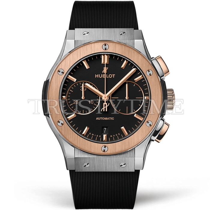 Часы Hublot из коллекции Classic Fusion Chronograph. Спортивные мужские часы Hublot Fusion Chronograph 45mm 521.NO.1181.RX премиального качества (Артикул магазина: HB-1182) оснащены надежным автоматическим механизмом с автоподзаводом (работает от амплитуды движения руки) калибра Valjoux-7750, в котором реализованы следующие функции: часовая, минутная и секундная стрелки, а так же хронограф, дата. Круглый корпус часов комбинированного сталь с розового золота цвета, имеющий размер 45 мм и высоту 15.5 мм превосходно дополнит образ и украсит запястье своего обладателя. Для изготовления часов Hublot Fusion Chronograph 45mm 521.NO.1181.RX предлагаемых в нашем интернет-магазине, применяются титан высокого качества (Швейцарский стандарт), а так же сапфировое стекло высокой прочности, благодаря чему обеспечивается максимальная защита от сколов и механических повреждений. Отличительной чертой данной модели является черный циферблат, часовые индексы которого обеспечивают часовые метки. Завершает образ каучуковый ремешок черного цвета с фирменной раскладывающейся застежкой Hublot. Водонепроницаемость данной модели составляет 30М (WR30) – допускается минимальное воздействие с водой.