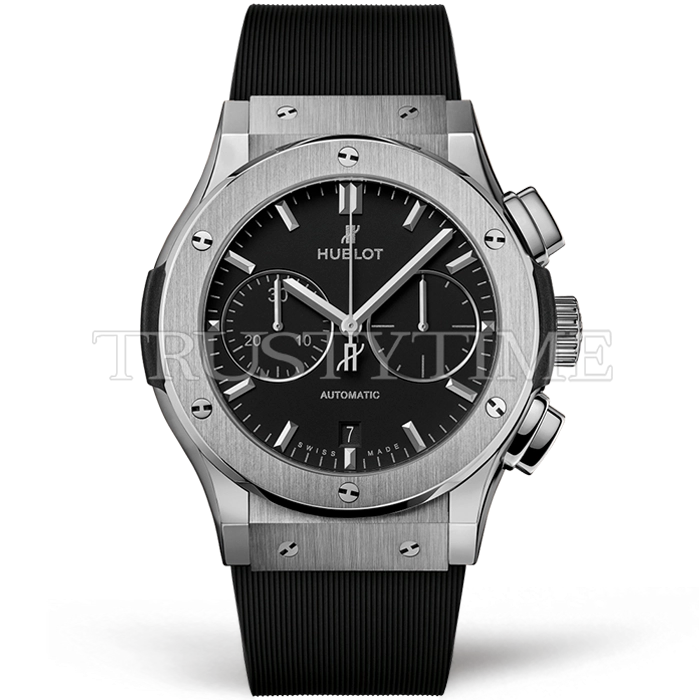 Часы Hublot из коллекции Classic Fusion Chronograph. Спортивные мужские часы Hublot Fusion Chronograph 45mm 521.NX.1171.RX премиального качества (Артикул магазина: HB-1183) оснащены надежным автоматическим механизмом с автоподзаводом (работает от амплитуды движения руки) калибра Valjoux-7750, в котором реализованы следующие функции: часовая, минутная и секундная стрелки, а так же хронограф, дата. Круглый корпус часов стального цвета, имеющий размер 45 мм и высоту 15.5 мм превосходно дополнит образ и украсит запястье своего обладателя. Для изготовления часов Hublot Fusion Chronograph 45mm 521.NX.1171.RX предлагаемых в нашем интернет-магазине, применяются титан высокого качества (Швейцарский стандарт), а так же сапфировое стекло высокой прочности, благодаря чему обеспечивается максимальная защита от сколов и механических повреждений. Отличительной чертой данной модели является черный циферблат, часовые индексы которого обеспечивают часовые метки. Завершает образ каучуковый ремешок черного цвета с фирменной раскладывающейся застежкой Hublot. Водонепроницаемость данной модели составляет 30М (WR30) – допускается минимальное воздействие с водой.