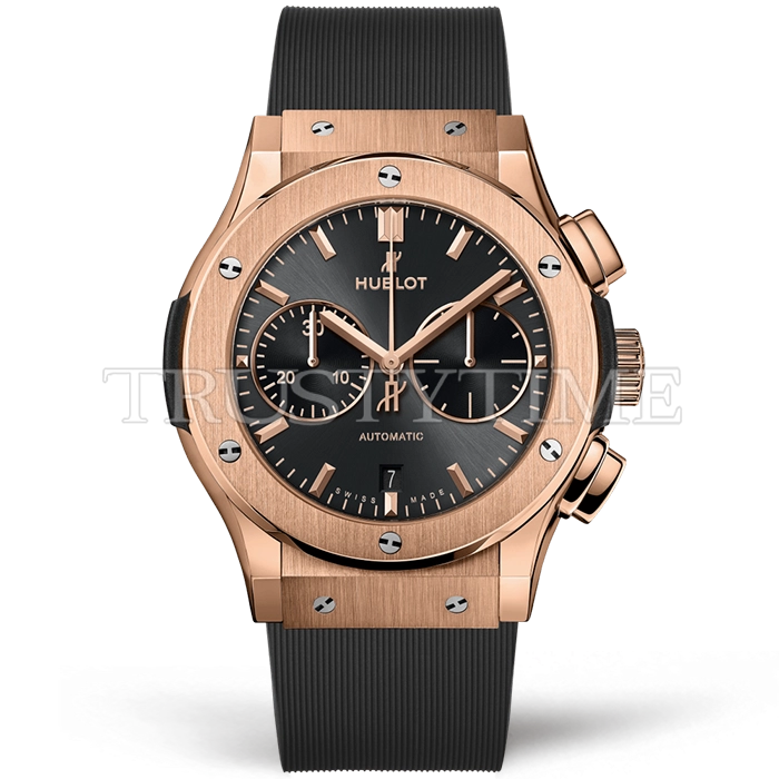 Часы Hublot из коллекции Classic Fusion Chronograph. Спортивные мужские часы Hublot Fusion Chronograph 45mm 521.OX.7081.RX премиального качества (Артикул магазина: HB-1188) оснащены надежным автоматическим механизмом с автоподзаводом (работает от амплитуды движения руки) калибра Valjoux-7750, в котором реализованы следующие функции: часовая, минутная и секундная стрелки, а так же хронограф, дата. Круглый корпус часов розового цвета, имеющий размер 45 мм и высоту 15.5 мм превосходно дополнит образ и украсит запястье своего обладателя. Для изготовления часов Hublot Fusion Chronograph 45mm 521.OX.7081.RX предлагаемых в нашем интернет-магазине, применяются нержавеющая сталь 316L высокого качества (Швейцарский стандарт), а так же сапфировое стекло высокой прочности, благодаря чему обеспечивается максимальная защита от сколов и механических повреждений. Отличительной чертой данной модели является серый циферблат, часовые индексы которого обеспечивают часовые метки. Завершает образ каучуковый ремешок серого цвета с фирменной раскладывающейся застежкой Hublot. Водонепроницаемость данной модели составляет 30М (WR30) – допускается минимальное воздействие с водой.