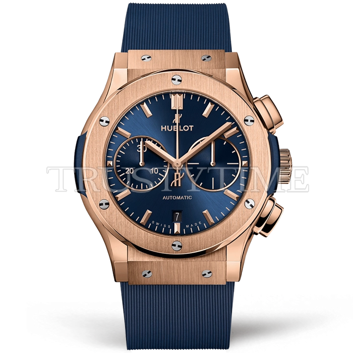 Часы Hublot из коллекции Classic Fusion Chronograph. Спортивные мужские часы Hublot Fusion Chronograph 45mm 521.OX.7180.RX премиального качества (Артикул магазина: HB-1189) оснащены надежным автоматическим механизмом с автоподзаводом (работает от амплитуды движения руки) калибра Valjoux-7750, в котором реализованы следующие функции: часовая, минутная и секундная стрелки, а так же хронограф, дата. Круглый корпус часов розового цвета, имеющий размер 45 мм и высоту 15.5 мм превосходно дополнит образ и украсит запястье своего обладателя. Для изготовления часов Hublot Fusion Chronograph 45mm 521.OX.7180.RX предлагаемых в нашем интернет-магазине, применяются нержавеющая сталь 316L высокого качества (Швейцарский стандарт), а так же сапфировое стекло высокой прочности, благодаря чему обеспечивается максимальная защита от сколов и механических повреждений. Отличительной чертой данной модели является синий циферблат, часовые индексы которого обеспечивают часовые метки. Завершает образ каучуковый ремешок синего цвета с фирменной раскладывающейся застежкой Hublot. Водонепроницаемость данной модели составляет 30М (WR30) – допускается минимальное воздействие с водой.
