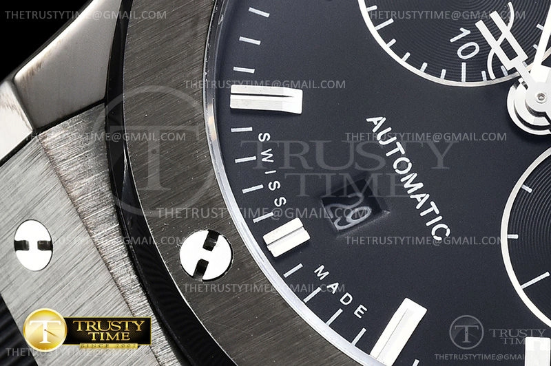 Часы Hublot из коллекции Classic Fusion Chronograph. Спортивные мужские часы Hublot Fusion Chronograph 45mm 521.CM.1171.RX премиального качества (Артикул магазина: HB-0526) оснащены надежным автоматическим механизмом с автоподзаводом (работает от амплитуды движения руки) калибра Valjoux-7750, в котором реализованы следующие функции: часовая, минутная и секундная стрелки, а так же хронограф, дата. Круглый корпус часов черного цвета, имеющий размер 45 мм и высоту 15.5 мм превосходно дополнит образ и украсит запястье своего обладателя. Для изготовления часов Hublot Fusion Chronograph 45mm 521.CM.1171.RX предлагаемых в нашем интернет-магазине, применяются нержавеющая сталь 316F высокого качества (Швейцарский стандарт), а так же сапфировое стекло высокой прочности, благодаря чему обеспечивается максимальная защита от сколов и механических повреждений. Отличительной чертой данной модели является черный циферблат, часовые индексы которого обеспечивают часовые метки. Завершает образ каучуковый ремешок черного цвета с фирменной раскладывающейся застежкой Hublot. Водонепроницаемость данной модели составляет 30М (WR30) – допускается минимальное воздействие с водой.