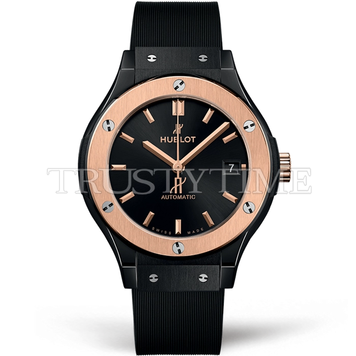 Часы Hublot из коллекции Classic Fusion. Классические женские часы Hublot Classic Fusion 38mm 565.CO.1480.RX премиального качества (Артикул магазина: HB-1099) оснащены надежным автоматическим механизмом с автоподзаводом (работает от амплитуды движения руки) калибра HUB1100, в котором реализованы следующие функции: часовая, минутная и секундная стрелки, а так же дата. Круглый корпус часов черного цвета, имеющий размер 38 мм и высоту 10 мм превосходно дополнит образ и украсит запястье своего обладателя. Для изготовления часов Hublot Classic Fusion 38mm 565.CO.1480.RX предлагаемых в нашем интернет-магазине, применяются керамика высокого качества (Швейцарский стандарт), а так же сапфировое стекло высокой прочности, благодаря чему обеспечивается максимальная защита от сколов и механических повреждений. Отличительной чертой данной модели является черный циферблат, часовые индексы которого обеспечивают часовые метки. Завершает образ каучуковый ремешок черного цвета с фирменной раскладывающейся застежкой Hublot. Водонепроницаемость данной модели составляет 30М (WR30) – допускается минимальное воздействие с водой.