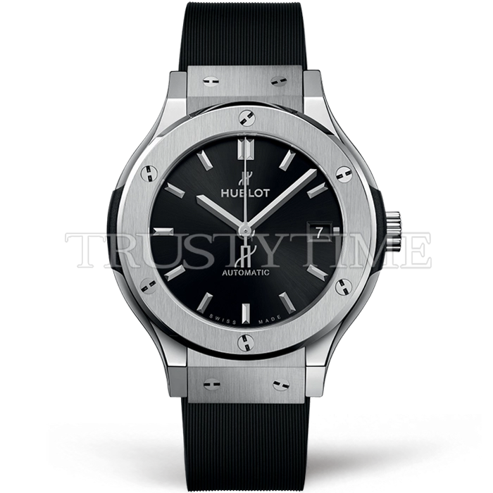 Часы Hublot из коллекции Classic Fusion. Классические женские часы Hublot Classic Fusion 38mm 565.NX.1470.RX премиального качества (Артикул магазина: HB-1102) оснащены надежным автоматическим механизмом с автоподзаводом (работает от амплитуды движения руки) калибра HUB1100, в котором реализованы следующие функции: часовая, минутная и секундная стрелки, а так же дата. Круглый корпус часов стального цвета, имеющий размер 38 мм и высоту 10 мм превосходно дополнит образ и украсит запястье своего обладателя. Для изготовления часов Hublot Classic Fusion 38mm 565.NX.1470.RX предлагаемых в нашем интернет-магазине, применяются титан высокого качества (Швейцарский стандарт), а так же сапфировое стекло высокой прочности, благодаря чему обеспечивается максимальная защита от сколов и механических повреждений. Отличительной чертой данной модели является черный циферблат, часовые индексы которого обеспечивают часовые метки. Завершает образ каучуковый ремешок черного цвета с фирменной раскладывающейся застежкой Hublot. Водонепроницаемость данной модели составляет 30М (WR30) – допускается минимальное воздействие с водой.