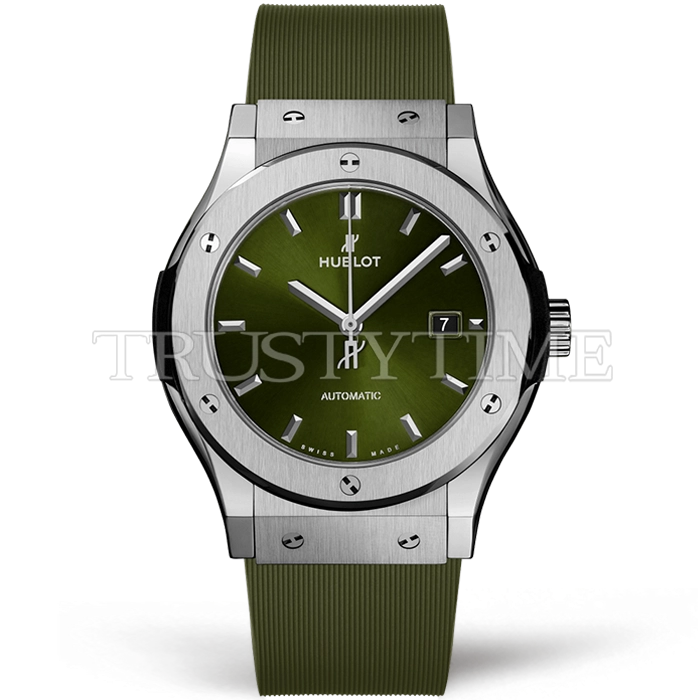 Часы Hublot из коллекции Classic Fusion. Классические мужские часы Hublot Classic Fusion 42mm 542.NX.8970.RX премиального качества (Артикул магазина: HB-1124) оснащены надежным автоматическим механизмом с автоподзаводом (работает от амплитуды движения руки) калибра HUB1100, в котором реализованы следующие функции: часовая, минутная и секундная стрелки, а так же дата. Круглый корпус часов стального цвета, имеющий размер 42 мм и высоту 9.5 мм превосходно дополнит образ и украсит запястье своего обладателя. Для изготовления часов Hublot Classic Fusion 42mm 542.NX.8970.RX предлагаемых в нашем интернет-магазине, применяются титан высокого качества (Швейцарский стандарт), а так же сапфировое стекло высокой прочности, благодаря чему обеспечивается максимальная защита от сколов и механических повреждений. Отличительной чертой данной модели является зеленый циферблат, часовые индексы которого обеспечивают часовые метки. Завершает образ каучуковый ремешок зеленого цвета с фирменной раскладывающейся застежкой Hublot. Водонепроницаемость данной модели составляет 30М (WR30) – допускается минимальное воздействие с водой.