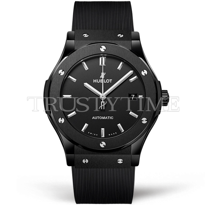 Часы Hublot из коллекции Classic Fusion. Классические мужские часы Hublot Classic Fusion 45mm 511.CM.1171.RX премиального качества (Артикул магазина: HB-1133) оснащены надежным автоматическим механизмом с автоподзаводом (работает от амплитуды движения руки) калибра HUB1100, в котором реализованы следующие функции: часовая, минутная и секундная стрелки, а так же дата. Круглый корпус часов черного цвета, имеющий размер 45 мм и высоту 9.5 мм превосходно дополнит образ и украсит запястье своего обладателя. Для изготовления часов Hublot Classic Fusion 45mm 511.CM.1171.RX предлагаемых в нашем интернет-магазине, применяются керамика высокого качества (Швейцарский стандарт), а так же сапфировое стекло высокой прочности, благодаря чему обеспечивается максимальная защита от сколов и механических повреждений. Отличительной чертой данной модели является черный циферблат, часовые индексы которого обеспечивают часовые метки. Завершает образ каучуковый ремешок черного цвета с фирменной раскладывающейся застежкой Hublot. Водонепроницаемость данной модели составляет 30М (WR30) – допускается минимальное воздействие с водой.