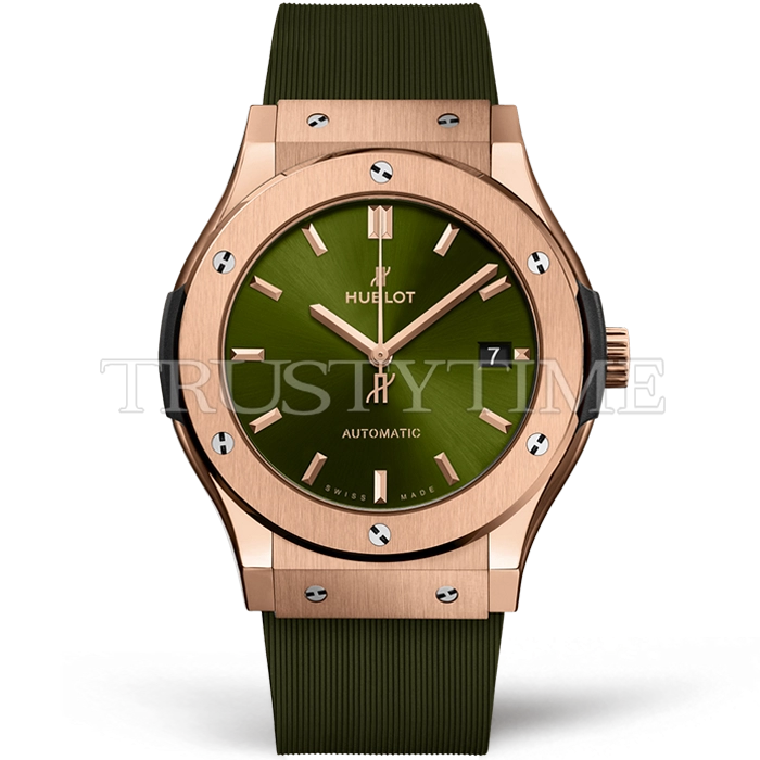 Часы Hublot из коллекции Classic Fusion. Классические мужские часы Hublot Classic Fusion 45mm 511.OX.8980.RX премиального качества (Артикул магазина: HB-1144) оснащены надежным автоматическим механизмом с автоподзаводом (работает от амплитуды движения руки) калибра HUB1100, в котором реализованы следующие функции: часовая, минутная и секундная стрелки, а так же дата. Круглый корпус часов розового цвета, имеющий размер 45 мм и высоту 9.5 мм превосходно дополнит образ и украсит запястье своего обладателя. Для изготовления часов Hublot Classic Fusion 45mm 511.OX.8980.RX предлагаемых в нашем интернет-магазине, применяются нержавеющая сталь 316L высокого качества (Швейцарский стандарт), а так же сапфировое стекло высокой прочности, благодаря чему обеспечивается максимальная защита от сколов и механических повреждений. Отличительной чертой данной модели является зеленый циферблат, часовые индексы которого обеспечивают часовые метки. Завершает образ каучуковый ремешок зеленого цвета с фирменной раскладывающейся застежкой Hublot. Водонепроницаемость данной модели составляет 30М (WR30) – допускается минимальное воздействие с водой.