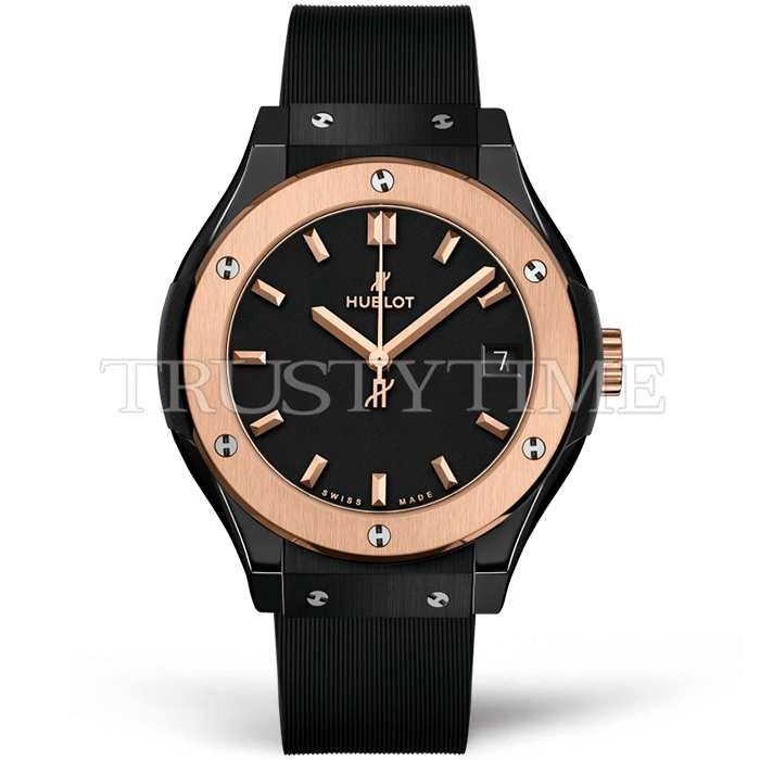 Часы Hublot из коллекции Classic Fusion. Классические женские часы Hublot Classic Fusion 33mm 581.CO.1181.RX премиального качества (Артикул магазина: HB-1198) оснащены надежным кварцевым механизмом (работает от батареи) калибра HUB2912, в котором реализованы следующие функции: часовая, минутная и секундная стрелки, а так же дата. Круглый корпус часов черного цвета, имеющий размер 33 мм и высоту 9 мм превосходно дополнит образ и украсит запястье своего обладателя. Для изготовления часов Hublot Classic Fusion 33mm 581.CO.1181.RX предлагаемых в нашем интернет-магазине, применяются керамика высокого качества (Швейцарский стандарт), а так же сапфировое стекло высокой прочности, благодаря чему обеспечивается максимальная защита от сколов и механических повреждений. Отличительной чертой данной модели является черный циферблат, часовые индексы которого обеспечивают часовые метки. Завершает образ каучуковый ремешок черного цвета с фирменной раскладывающейся застежкой Hublot. Водонепроницаемость данной модели составляет 30М (WR30) – допускается минимальное воздействие с водой.