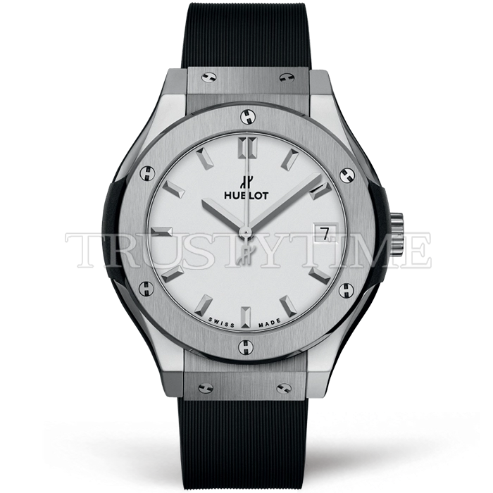 Часы Hublot из коллекции Classic Fusion. Классические женские часы Hublot Classic Fusion 33mm 581.NX.2611.RX премиального качества (Артикул магазина: HB-1203) оснащены надежным кварцевым механизмом (работает от батареи) калибра HUB2912, в котором реализованы следующие функции: часовая, минутная и секундная стрелки, а так же дата. Круглый корпус часов стального цвета, имеющий размер 33 мм и высоту 9 мм превосходно дополнит образ и украсит запястье своего обладателя. Для изготовления часов Hublot Classic Fusion 33mm 581.NX.2611.RX предлагаемых в нашем интернет-магазине, применяются титан высокого качества (Швейцарский стандарт), а так же сапфировое стекло высокой прочности, благодаря чему обеспечивается максимальная защита от сколов и механических повреждений. Отличительной чертой данной модели является белый циферблат, часовые индексы которого обеспечивают часовые метки. Завершает образ каучуковый ремешок черного цвета с фирменной раскладывающейся застежкой Hublot. Водонепроницаемость данной модели составляет 30М (WR30) – допускается минимальное воздействие с водой.
