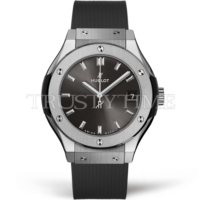 Часы Hublot из коллекции Classic Fusion. Классические женские часы Hublot Classic Fusion 33mm 581.NX.7071.RX премиального качества (Артикул магазина: HB-1204) оснащены надежным кварцевым механизмом (работает от батареи) калибра HUB2912, в котором реализованы следующие функции: часовая, минутная и секундная стрелки, а так же дата. Круглый корпус часов стального цвета, имеющий размер 33 мм и высоту 9 мм превосходно дополнит образ и украсит запястье своего обладателя. Для изготовления часов Hublot Classic Fusion 33mm 581.NX.7071.RX предлагаемых в нашем интернет-магазине, применяются титан высокого качества (Швейцарский стандарт), а так же сапфировое стекло высокой прочности, благодаря чему обеспечивается максимальная защита от сколов и механических повреждений. Отличительной чертой данной модели является серый циферблат, часовые индексы которого обеспечивают часовые метки. Завершает образ каучуковый ремешок черного цвета с фирменной раскладывающейся застежкой Hublot. Водонепроницаемость данной модели составляет 30М (WR30) – допускается минимальное воздействие с водой.