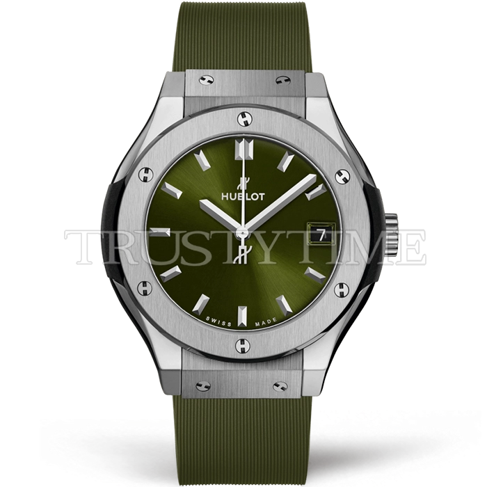 Часы Hublot из коллекции Classic Fusion. Классические женские часы Hublot Classic Fusion 33mm 581.NX.8970.RX премиального качества (Артикул магазина: HB-1206) оснащены надежным кварцевым механизмом (работает от батареи) калибра HUB2912, в котором реализованы следующие функции: часовая, минутная и секундная стрелки, а так же дата. Круглый корпус часов стального цвета, имеющий размер 33 мм и высоту 9 мм превосходно дополнит образ и украсит запястье своего обладателя. Для изготовления часов Hublot Classic Fusion 33mm 581.NX.8970.RX предлагаемых в нашем интернет-магазине, применяются титан высокого качества (Швейцарский стандарт), а так же сапфировое стекло высокой прочности, благодаря чему обеспечивается максимальная защита от сколов и механических повреждений. Отличительной чертой данной модели является зеленый циферблат, часовые индексы которого обеспечивают часовые метки. Завершает образ каучуковый ремешок зеленого цвета с фирменной раскладывающейся застежкой Hublot. Водонепроницаемость данной модели составляет 30М (WR30) – допускается минимальное воздействие с водой.