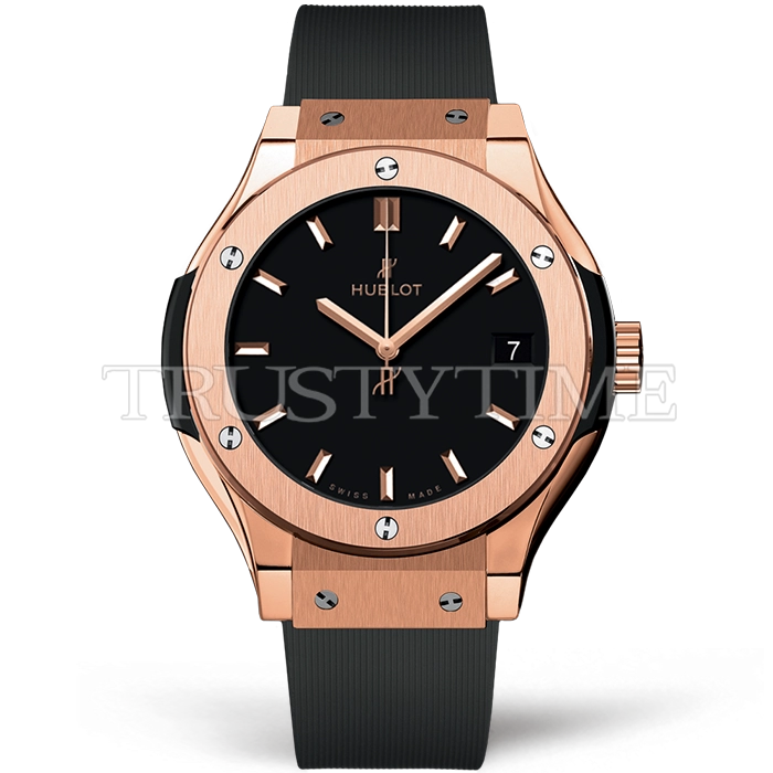 Часы Hublot из коллекции Classic Fusion. Классические женские часы Hublot Classic Fusion 33mm 581.OX.1181.RX премиального качества (Артикул магазина: HB-1209) оснащены надежным кварцевым механизмом (работает от батареи) калибра HUB2912, в котором реализованы следующие функции: часовая, минутная и секундная стрелки, а так же дата. Круглый корпус часов розового цвета, имеющий размер 33 мм и высоту 9 мм превосходно дополнит образ и украсит запястье своего обладателя. Для изготовления часов Hublot Classic Fusion 33mm 581.OX.1181.RX предлагаемых в нашем интернет-магазине, применяются нержавеющая сталь 316F высокого качества (Швейцарский стандарт), а так же сапфировое стекло высокой прочности, благодаря чему обеспечивается максимальная защита от сколов и механических повреждений. Отличительной чертой данной модели является черный циферблат, часовые индексы которого обеспечивают часовые метки. Завершает образ каучуковый ремешок черного цвета с фирменной раскладывающейся застежкой Hublot. Водонепроницаемость данной модели составляет 30М (WR30) – допускается минимальное воздействие с водой.