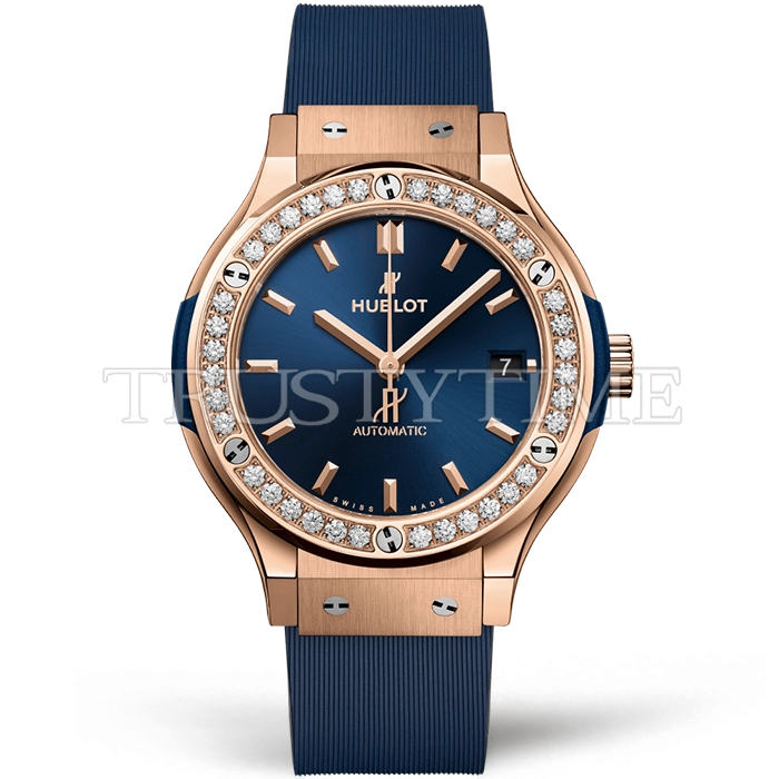 Часы Hublot из коллекции Classic Fusion. Классические женские часы Hublot Classic Fusion 38mm 565.OX.7180.RX.1204 премиального качества (Артикул магазина: HB-1221) оснащены надежным автоматическим механизмом с автоподзаводом (работает от амплитуды движения руки) калибра HUB1100, в котором реализованы следующие функции: часовая, минутная и секундная стрелки, а так же дата. Круглый корпус часов розового цвета, имеющий размер 38 мм и высоту 10 мм превосходно дополнит образ и украсит запястье своего обладателя. Для изготовления часов Hublot Classic Fusion 38mm 565.OX.7180.RX.1204 предлагаемых в нашем интернет-магазине, применяются нержавеющая сталь 316F высокого качества (Швейцарский стандарт), а так же сапфировое стекло высокой прочности, благодаря чему обеспечивается максимальная защита от сколов и механических повреждений. Отличительной чертой данной модели является синий циферблат, часовые индексы которого обеспечивают часовые метки. Завершает образ каучуковый ремешок синего цвета с фирменной раскладывающейся застежкой Hublot. Водонепроницаемость данной модели составляет 30М (WR30) – допускается минимальное воздействие с водой.