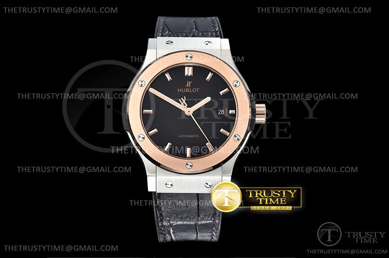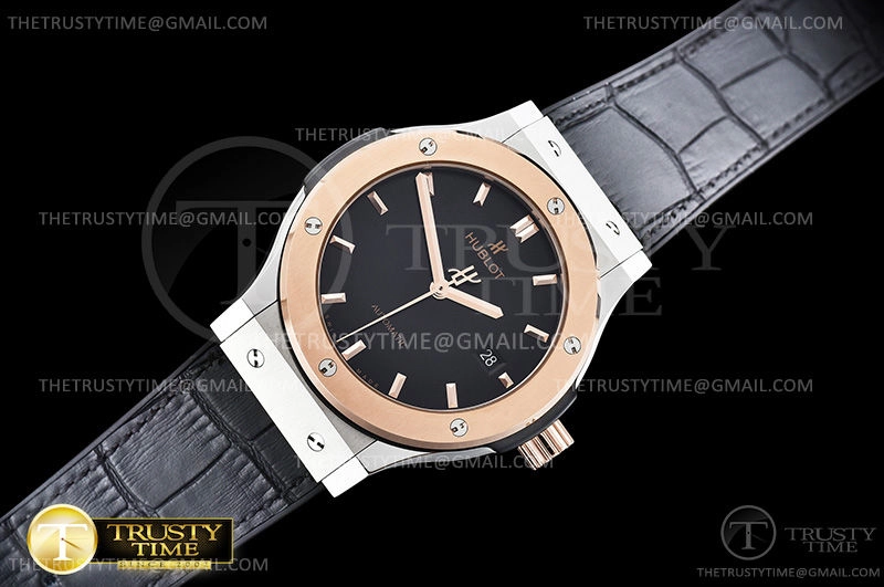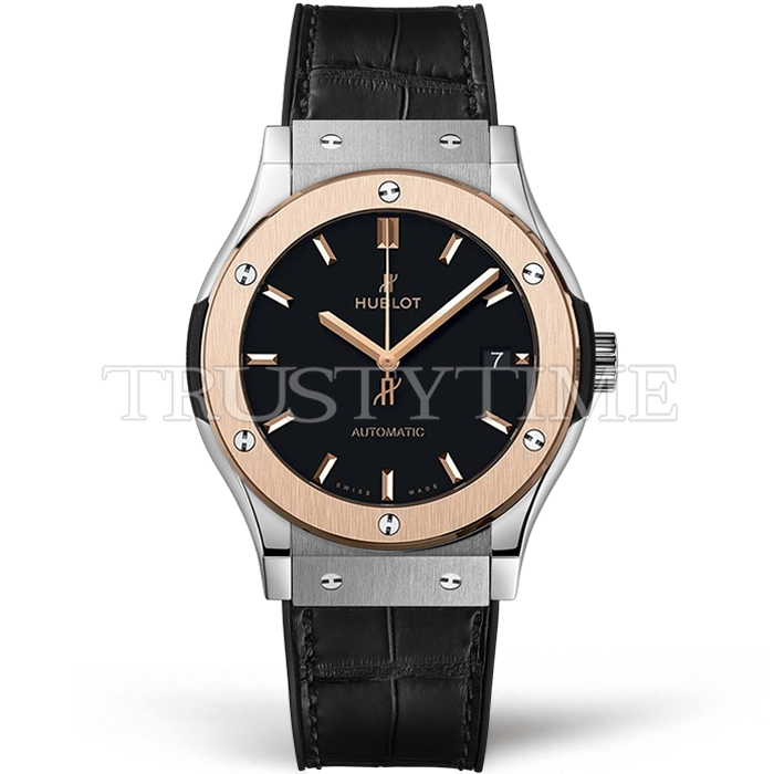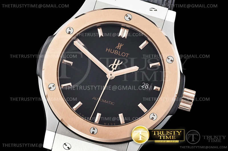 Часы Hublot из коллекции Classic Fusion. Классические мужские часы Hublot Classic Fusion 42mm 542.NO.1181.LR премиального качества (Артикул магазина: HB-0506) оснащены надежным автоматическим механизмом с автоподзаводом (работает от амплитуды движения руки) калибра HUB1100, в котором реализованы следующие функции: часовая, минутная и секундная стрелки, а так же дата. Круглый корпус часов комбинированного сталь с розового золота цвета, имеющий размер 42 мм и высоту 9.5 мм превосходно дополнит образ и украсит запястье своего обладателя. Для изготовления часов Hublot Classic Fusion 42mm 542.NO.1181.LR предлагаемых в нашем интернет-магазине, применяются титан высокого качества (Швейцарский стандарт), а так же сапфировое стекло высокой прочности, благодаря чему обеспечивается максимальная защита от сколов и механических повреждений. Отличительной чертой данной модели является черный циферблат, часовые индексы которого обеспечивают часовые метки. Завершает образ кожаный ремешок черного цвета с фирменной раскладывающейся застежкой Hublot. Водонепроницаемость данной модели составляет 30М (WR30) – допускается минимальное воздействие с водой.