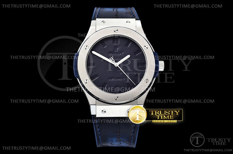 Часы Hublot из коллекции Classic Fusion. Классические мужские часы Hublot Classic Fusion Berluti Scritto 45mm 511.NX.050B.VR.BER16 премиального качества (Артикул магазина: HB-0490) оснащены надежным автоматическим механизмом с автоподзаводом (работает от амплитуды движения руки) калибра ETA2892-2, в котором реализованы следующие функции: часовая, минутная и секундная стрелки, а так же максимально простой функционал без усложнений. Круглый корпус часов стального цвета, имеющий размер 45 мм и высоту 9.5 мм превосходно дополнит образ и украсит запястье своего обладателя. Для изготовления часов Hublot Classic Fusion Berluti Scritto 45mm 511.NX.050B.VR.BER16 предлагаемых в нашем интернет-магазине, применяются титан высокого качества (Швейцарский стандарт), а так же сапфировое стекло высокой прочности, благодаря чему обеспечивается максимальная защита от сколов и механических повреждений. Отличительной чертой данной модели является синий циферблат, часовые индексы которого обеспечивают часовые метки. Завершает образ кожаный ремешок синего цвета с фирменной раскладывающейся застежкой Hublot. Водонепроницаемость данной модели составляет 30М (WR30) – допускается минимальное воздействие с водой.