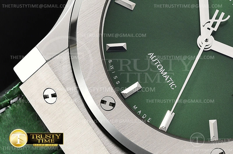 Часы Hublot из коллекции Classic Fusion. Классические мужские часы Hublot Classic Fusion 42mm 542.NX.8970.LR премиального качества (Артикул магазина: HB-0488) оснащены надежным автоматическим механизмом с автоподзаводом (работает от амплитуды движения руки) калибра HUB1100, в котором реализованы следующие функции: часовая, минутная и секундная стрелки, а так же дата. Круглый корпус часов стального цвета, имеющий размер 42 мм и высоту 9.5 мм превосходно дополнит образ и украсит запястье своего обладателя. Для изготовления часов Hublot Classic Fusion 42mm 542.NX.8970.LR предлагаемых в нашем интернет-магазине, применяются титан высокого качества (Швейцарский стандарт), а так же сапфировое стекло высокой прочности, благодаря чему обеспечивается максимальная защита от сколов и механических повреждений. Отличительной чертой данной модели является зеленый циферблат, часовые индексы которого обеспечивают часовые метки. Завершает образ кожаный ремешок зеленого цвета с фирменной раскладывающейся застежкой Hublot. Водонепроницаемость данной модели составляет 30М (WR30) – допускается минимальное воздействие с водой.