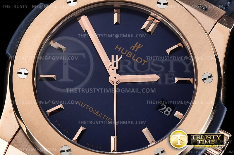 Часы Hublot из коллекции Classic Fusion. Классические мужские часы Hublot Classic Fusion 45mm 511.OX.7180.LR премиального качества (Артикул магазина: HB-0476) оснащены надежным автоматическим механизмом с автоподзаводом (работает от амплитуды движения руки) калибра HUB1100, в котором реализованы следующие функции: часовая, минутная и секундная стрелки, а так же дата. Круглый корпус часов розового цвета, имеющий размер 45 мм и высоту 9.5 мм превосходно дополнит образ и украсит запястье своего обладателя. Для изготовления часов Hublot Classic Fusion 45mm 511.OX.7180.LR предлагаемых в нашем интернет-магазине, применяются нержавеющая сталь 316L высокого качества (Швейцарский стандарт), а так же сапфировое стекло высокой прочности, благодаря чему обеспечивается максимальная защита от сколов и механических повреждений. Отличительной чертой данной модели является синий циферблат, часовые индексы которого обеспечивают часовые метки. Завершает образ кожаный ремешок синего цвета с фирменной раскладывающейся застежкой Hublot. Водонепроницаемость данной модели составляет 30М (WR30) – допускается минимальное воздействие с водой.