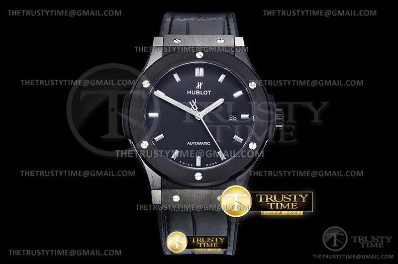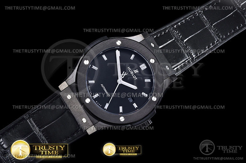 Часы Hublot из коллекции Classic Fusion. Классические мужские часы Hublot Classic Fusion 45mm 511.CM.1171.RX премиального качества (Артикул магазина: HB-0564) оснащены надежным автоматическим механизмом с автоподзаводом (работает от амплитуды движения руки) калибра HUB1112, в котором реализованы следующие функции: часовая, минутная и секундная стрелки, а так же дата. Круглый корпус часов черного цвета, имеющий размер 45 мм и высоту 9.5 мм превосходно дополнит образ и украсит запястье своего обладателя. Для изготовления часов Hublot Classic Fusion 45mm 511.CM.1171.RX предлагаемых в нашем интернет-магазине, применяются керамика высокого качества (Швейцарский стандарт), а так же сапфировое стекло высокой прочности, благодаря чему обеспечивается максимальная защита от сколов и механических повреждений. Отличительной чертой данной модели является черный циферблат, часовые индексы которого обеспечивают часовые метки. Завершает образ кожаный ремешок черного цвета с фирменной раскладывающейся застежкой Hublot. Водонепроницаемость данной модели составляет 30М (WR30) – допускается минимальное воздействие с водой.