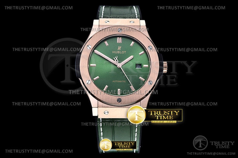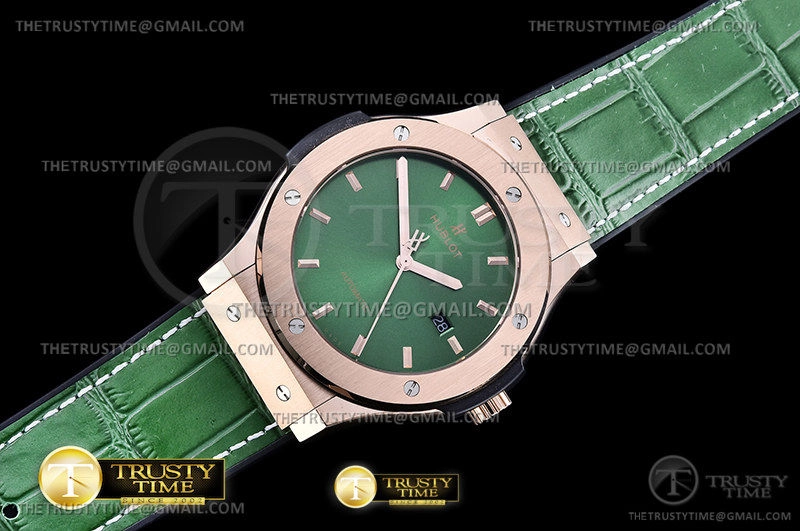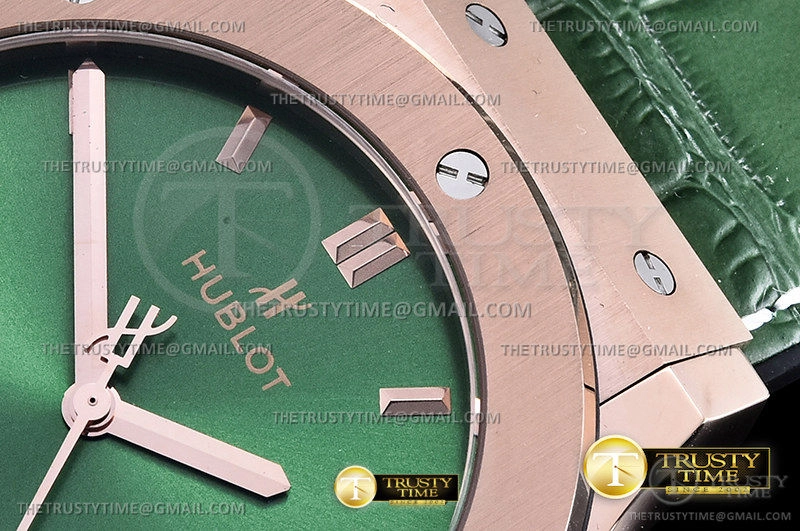 Часы Hublot из коллекции Classic Fusion. Классические мужские часы Hublot Classic Fusion 45mm 511.OX.8980.LR премиального качества (Артикул магазина: HB-0574) оснащены надежным автоматическим механизмом с автоподзаводом (работает от амплитуды движения руки) калибра HUB1112, в котором реализованы следующие функции: часовая, минутная и секундная стрелки, а так же дата. Круглый корпус часов розового цвета, имеющий размер 45 мм и высоту 9.5 мм превосходно дополнит образ и украсит запястье своего обладателя. Для изготовления часов Hublot Classic Fusion 45mm 511.OX.8980.LR предлагаемых в нашем интернет-магазине, применяются нержавеющая сталь 316L высокого качества (Швейцарский стандарт), а так же сапфировое стекло высокой прочности, благодаря чему обеспечивается максимальная защита от сколов и механических повреждений. Отличительной чертой данной модели является зеленый циферблат, часовые индексы которого обеспечивают часовые метки. Завершает образ кожаный ремешок зеленого цвета с фирменной раскладывающейся застежкой Hublot. Водонепроницаемость данной модели составляет 30М (WR30) – допускается минимальное воздействие с водой.