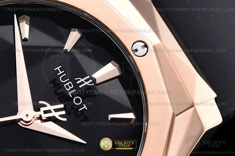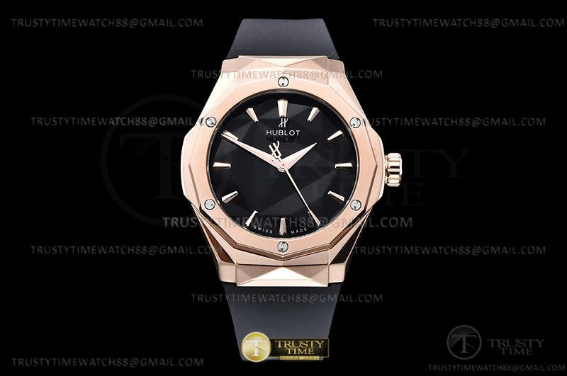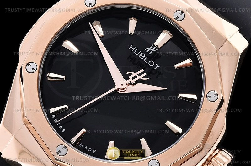 Часы Hublot из коллекции Classic Fusion Orlinski. Классические мужские часы Hublot Сlassic Fusion Orlinski 550.OS.1800.RX.ORL19 40 mm премиального качества (Артикул магазина: HB-0999) оснащены надежным автоматическим механизмом с автоподзаводом (работает от амплитуды движения руки) калибра HUB1100, в котором реализованы следующие функции: часовая, минутная и секундная стрелки, а так же максимально простой функционал без усложнений. Многогранный корпус часов розового цвета, имеющий размер 40 мм и высоту 11 мм превосходно дополнит образ и украсит запястье своего обладателя. Для изготовления часов Hublot Сlassic Fusion Orlinski 550.OS.1800.RX.ORL19 40 mm предлагаемых в нашем интернет-магазине, применяются нержавеющая сталь 316L высокого качества (Швейцарский стандарт), а так же сапфировое стекло высокой прочности, благодаря чему обеспечивается максимальная защита от сколов и механических повреждений. Отличительной чертой данной модели является черный циферблат, часовые индексы которого обеспечивают часовые метки. Завершает образ каучуковый ремешок черного цвета с фирменной раскладывающейся застежкой Hublot. Водонепроницаемость данной модели составляет 30М (WR30) – допускается минимальное воздействие с водой.