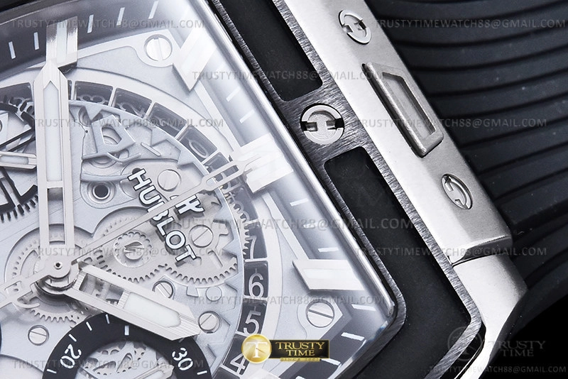 Часы Hublot из коллекции Spirit Of Big Bang. Спортивные мужские часы Hublot Spirit Of Big Bang Titanium Ceramic 42 642.NM.0170.RX премиального качества (Артикул магазина: HB-1272) оснащены надежным автоматическим механизмом с автоподзаводом (работает от амплитуды движения руки) калибра HUB4700, в котором реализованы следующие функции: часовая, минутная и секундная стрелки, а так же хронограф, дата. Бочкообразный корпус часов стального цвета, имеющий размер 42 мм и высоту 16 мм превосходно дополнит образ и украсит запястье своего обладателя. Для изготовления часов Hublot Spirit Of Big Bang Titanium Ceramic 42 642.NM.0170.RX предлагаемых в нашем интернет-магазине, применяются титан высокого качества (Швейцарский стандарт), а так же сапфировое стекло высокой прочности, благодаря чему обеспечивается максимальная защита от сколов и механических повреждений. Отличительной чертой данной модели является скелетонизированный циферблат, часовые индексы которого обеспечивают часовые метки. Завершает образ каучуковый ремешок черного цвета с фирменной раскладывающейся застежкой Hublot. Водонепроницаемость данной модели составляет 30М (WR30) – допускается минимальное воздействие с водой.
