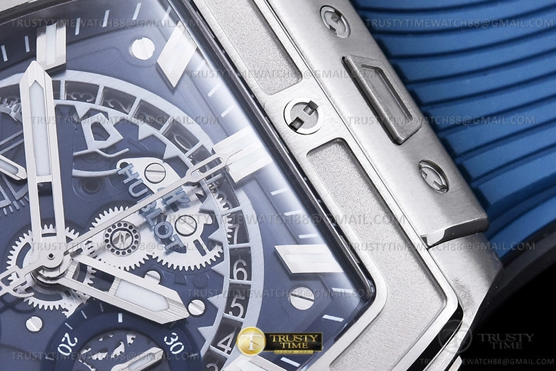 Часы Hublot из коллекции Spirit Of Big Bang. Спортивные мужские часы Hublot Spirit Of Big Bang Titanium 42 642.NX.7170.RX премиального качества (Артикул магазина: HB-1275) оснащены надежным автоматическим механизмом с автоподзаводом (работает от амплитуды движения руки) калибра HUB4700, в котором реализованы следующие функции: часовая, минутная и секундная стрелки, а так же хронограф, дата. Бочкообразный корпус часов стального цвета, имеющий размер 42 мм и высоту 16 мм превосходно дополнит образ и украсит запястье своего обладателя. Для изготовления часов Hublot Spirit Of Big Bang Titanium 42 642.NX.7170.RX предлагаемых в нашем интернет-магазине, применяются титан высокого качества (Швейцарский стандарт), а так же сапфировое стекло высокой прочности, благодаря чему обеспечивается максимальная защита от сколов и механических повреждений. Отличительной чертой данной модели является скелетонизированный циферблат, часовые индексы которого обеспечивают часовые метки. Завершает образ каучуковый ремешок синего цвета с фирменной раскладывающейся застежкой Hublot. Водонепроницаемость данной модели составляет 30М (WR30) – допускается минимальное воздействие с водой.