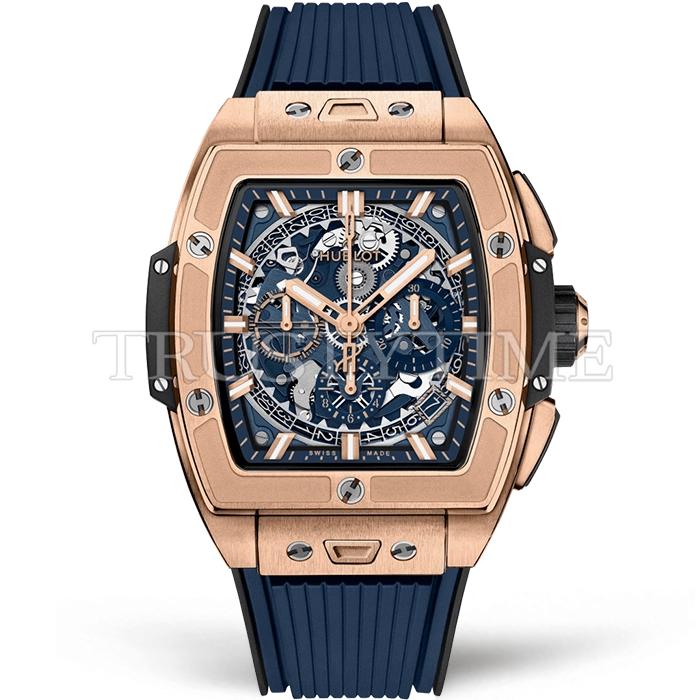 Часы Hublot из коллекции Spirit Of Big Bang. Спортивные мужские часы Hublot Spirit Of Big Bang King Gold Blue Ceramic 42 642.OX.7180.RX премиального качества (Артикул магазина: HB-1279) оснащены надежным автоматическим механизмом с автоподзаводом (работает от амплитуды движения руки) калибра HUB4700, в котором реализованы следующие функции: часовая, минутная и секундная стрелки, а так же хронограф, дата. Бочкообразный корпус часов розового цвета, имеющий размер 42 мм и высоту 16 мм превосходно дополнит образ и украсит запястье своего обладателя. Для изготовления часов Hublot Spirit Of Big Bang King Gold Blue Ceramic 42 642.OX.7180.RX предлагаемых в нашем интернет-магазине, применяются нержавеющая сталь 316F высокого качества (Швейцарский стандарт), а так же сапфировое стекло высокой прочности, благодаря чему обеспечивается максимальная защита от сколов и механических повреждений. Отличительной чертой данной модели является скелетонизированный циферблат, часовые индексы которого обеспечивают часовые метки. Завершает образ каучуковый ремешок синего цвета с фирменной раскладывающейся застежкой Hublot. Водонепроницаемость данной модели составляет 30М (WR30) – допускается минимальное воздействие с водой.