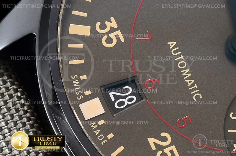 Часы IWC из коллекции Big Pilot's. Классические мужские часы IWC Big Pilot's Watch Top Gun Miramar 48mm IW501902 премиального качества (Артикул магазина: IW-0470) оснащены надежным автоматическим механизмом с автоподзаводом (работает от амплитуды движения руки) калибра IWC521111, в котором реализованы следующие функции: часовая, минутная и секундная стрелки, а так же резерв хода, дата. Круглый корпус часов черного цвета, имеющий размер 48 мм и высоту 16 мм превосходно дополнит образ и украсит запястье своего обладателя. Для изготовления часов IWC Big Pilot's Watch Top Gun Miramar 48mm IW501902 предлагаемых в нашем интернет-магазине, применяются керамика высокого качества (Швейцарский стандарт), а так же сапфировое стекло высокой прочности, благодаря чему обеспечивается максимальная защита от сколов и механических повреждений. Отличительной чертой данной модели является серый циферблат, часовые индексы которого обеспечивают арабские цифры. Завершает образ нейлоновый ремешок зеленого цвета с фирменной классической застежкой IWC. Водонепроницаемость данной модели составляет 30М (WR30) – допускается минимальное воздействие с водой.