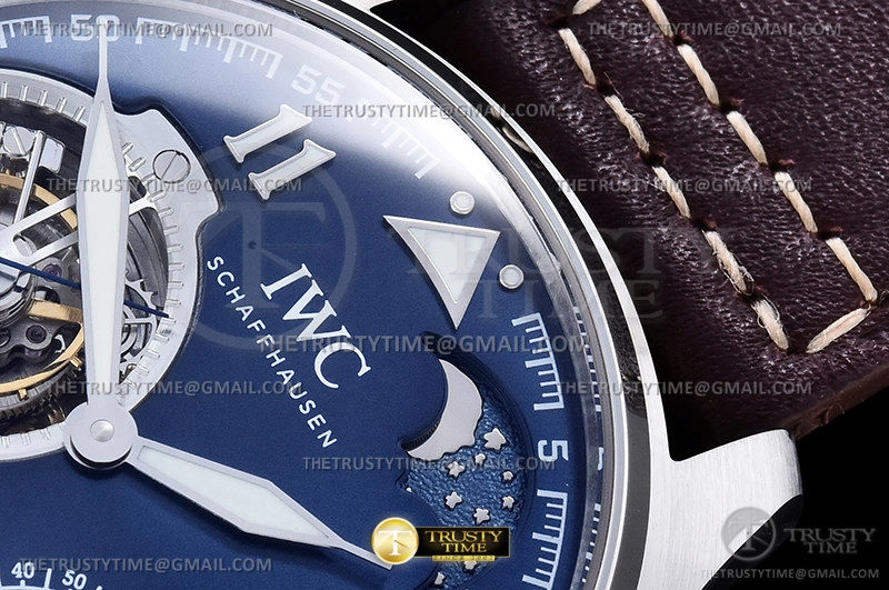 Часы IWC из коллекции Big Pilot's. Классические мужские часы IWC Big Pilot's Watch Constant-force Tourbillon Edition Le Petit Prince 46mm IW590302 премиального качества (Артикул магазина: IW-0750) оснащены надежным автоматическим механизмом с ручным заводом калибра IWC94805, в котором реализованы следующие функции: часовая, минутная и секундная стрелки, а так же турбийон, резерв хода, фаза луны. Круглый корпус часов стального цвета, имеющий размер 46.2 мм и высоту 13.5 мм превосходно дополнит образ и украсит запястье своего обладателя. Для изготовления часов IWC Big Pilot's Watch Constant-force Tourbillon Edition Le Petit Prince 46mm IW590302 предлагаемых в нашем интернет-магазине, применяются нержавеющая сталь 316L высокого качества (Швейцарский стандарт), а так же сапфировое стекло высокой прочности, благодаря чему обеспечивается максимальная защита от сколов и механических повреждений. Отличительной чертой данной модели является синий циферблат, часовые индексы которого обеспечивают арабские цифры. Завершает образ кожаный ремешок коричневого цвета с фирменной раскладывающейся застежкой IWC. Водонепроницаемость данной модели составляет 30М (WR30) – допускается минимальное воздействие с водой.