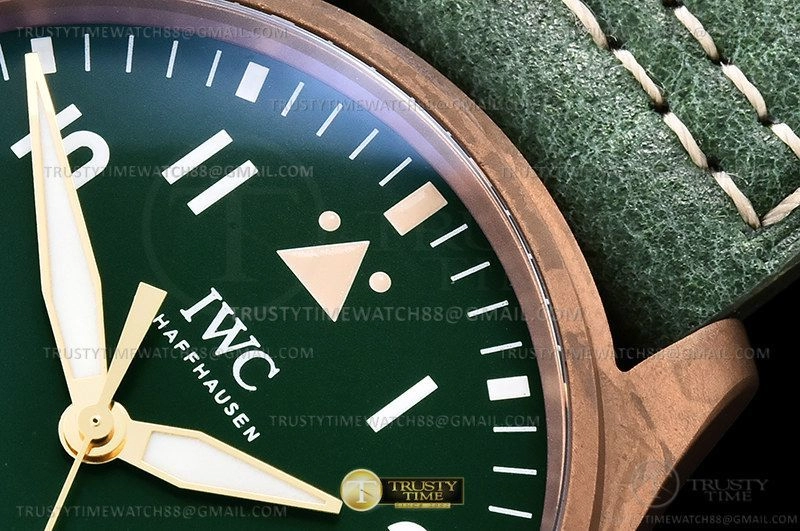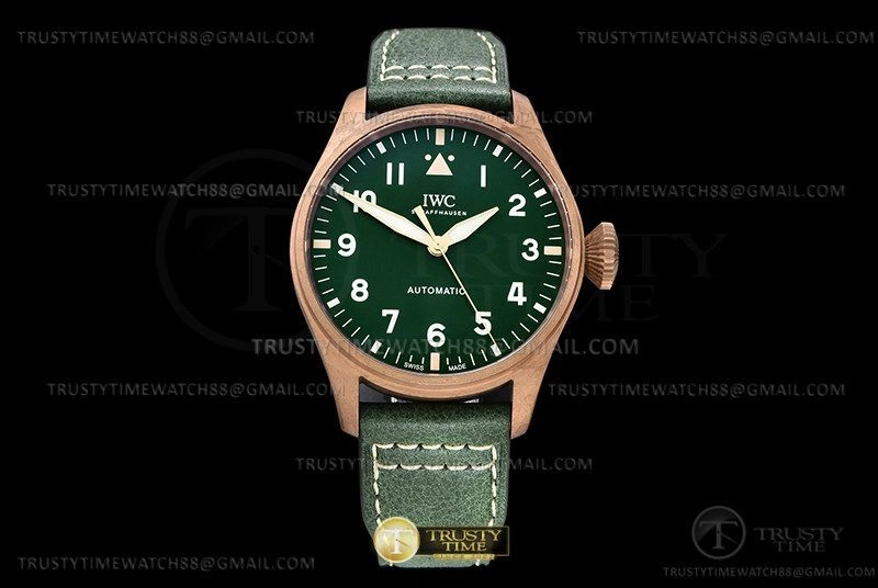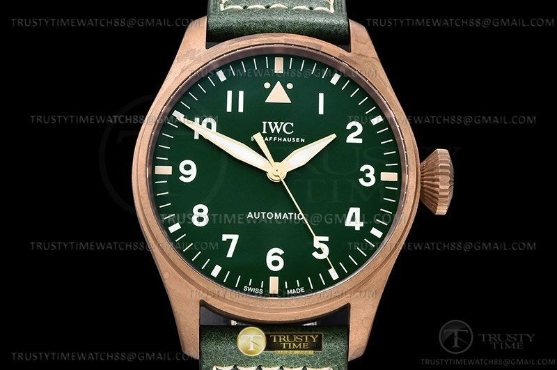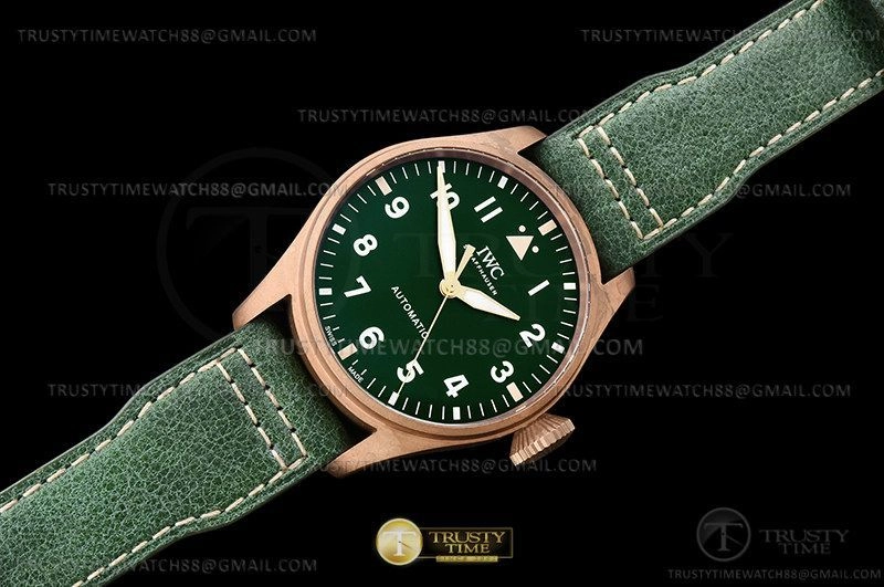 Часы IWC из коллекции Big Pilot's. Классические мужские часы IWC Big Pilot's Watch Spitfire 43mm IW329702 премиального качества (Артикул магазина: IW-0776) оснащены надежным автоматическим механизмом с автоподзаводом (работает от амплитуды движения руки) калибра ETA2824-2, в котором реализованы следующие функции: часовая, минутная и секундная стрелки, а так же максимально простой функционал без усложнений. Круглый корпус часов бронзового цвета, имеющий размер 43 мм и высоту 14 мм превосходно дополнит образ и украсит запястье своего обладателя. Для изготовления часов IWC Big Pilot's Watch Spitfire 43mm IW329702 предлагаемых в нашем интернет-магазине, применяются бронза высокого качества (Швейцарский стандарт), а так же сапфировое стекло высокой прочности, благодаря чему обеспечивается максимальная защита от сколов и механических повреждений. Отличительной чертой данной модели является зеленый циферблат, часовые индексы которого обеспечивают арабские цифры. Завершает образ кожаный ремешок зеленого цвета с фирменной классической застежкой IWC. Водонепроницаемость данной модели составляет 30М (WR30) – допускается минимальное воздействие с водой.
