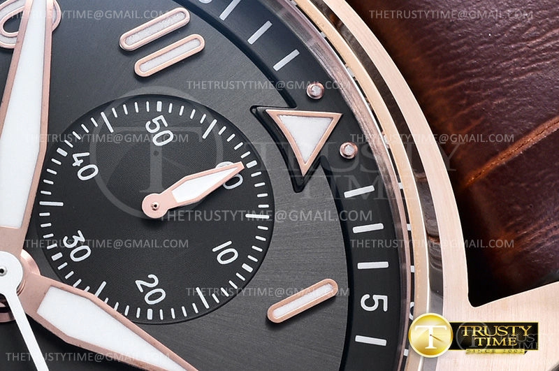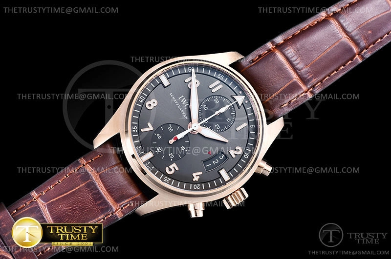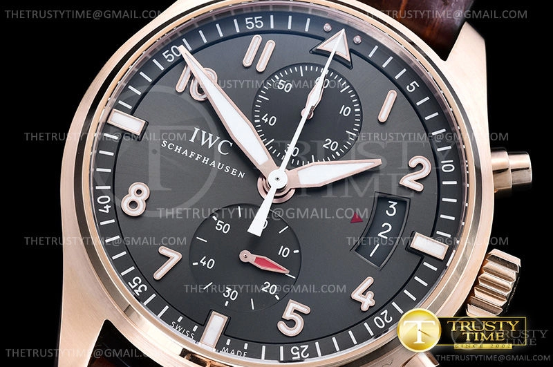 Часы IWC из коллекции Pilot's Chronograph. Спортивные мужские часы IWC Pilot's Watch Spitfire Chronograph 43mm IW387803 премиального качества (Артикул магазина: IW-0544) оснащены надежным автоматическим механизмом с автоподзаводом (работает от амплитуды движения руки) калибра Valjoux-7750, в котором реализованы следующие функции: часовая, минутная и секундная стрелки, а так же хронограф, дата. Круглый корпус часов розового цвета, имеющий размер 43 мм и высоту 16 мм превосходно дополнит образ и украсит запястье своего обладателя. Для изготовления часов IWC Pilot's Watch Spitfire Chronograph 43mm IW387803 предлагаемых в нашем интернет-магазине, применяются нержавеющая сталь 316F высокого качества (Швейцарский стандарт), а так же сапфировое стекло высокой прочности, благодаря чему обеспечивается максимальная защита от сколов и механических повреждений. Отличительной чертой данной модели является серый циферблат, часовые индексы которого обеспечивают арабские цифры. Завершает образ кожаный ремешок коричневого цвета с фирменной раскладывающейся застежкой IWC. Водонепроницаемость данной модели составляет 30М (WR30) – допускается минимальное воздействие с водой.